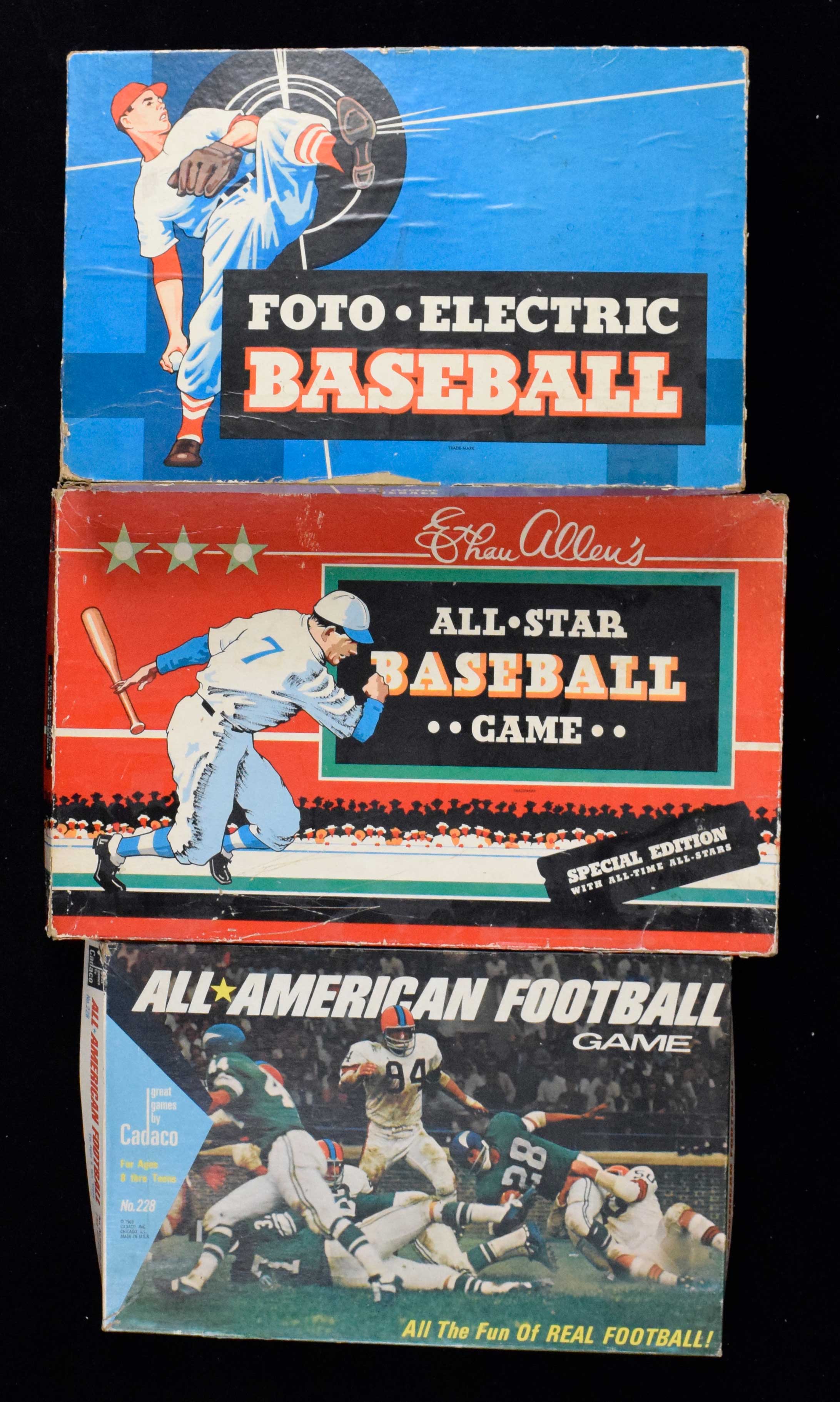 Description:Lot of (5) vintage sports board games, including Cadaco baseball & football, c. 1949-1967 (VG/EX). Outstanding lot of vintage board games, with (1) c. 1949 Cadaco-Ellis Foto Electric Baseball; (1) c. 1953 Cadaco-Ellis All-Star Baseball Game; (1) c. 1969 Cadaco All American Football game; (1) c. 1969 Cadaco All-Star Hockey game and (1) c. 1967 Ideal All-Pro Football game. Most boxes appear VG/EX with contents inside in nicer condition. Note: Most key parts in the games appear to be present, but games have not been checked for 100 % completion and it is possible that some are missing parts/accessories of instructions.