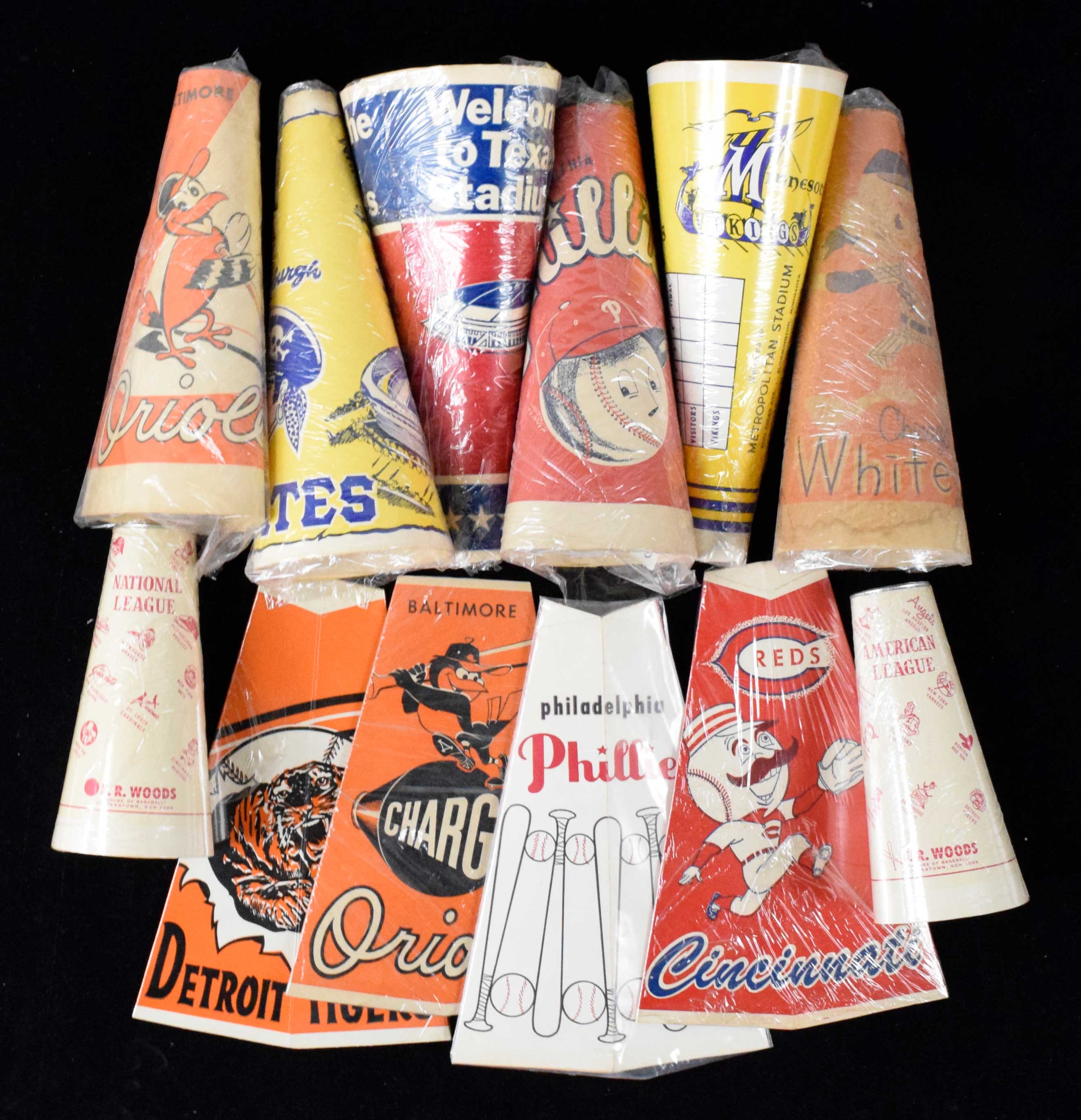 Description:Lot of (12) popcorn megaphones, including Phillies and Cowboys, c. 1950s-1970s (GD-EX/MT). Nice lot of vintage baseball and football popcorn megaphones, which make for nostalgic display pieces. Each has been wrapped in cellophane (removable), with most 10" high unless noted, and (4) flattened (noted below). Includes (1) Phillies; (1) White Sox; (1) Cowboys; (2) F.R. Woods American League (7"); (1) Orioles; (1) Vikings; (1) Pirates. Flattened megaphones include (1) Orioles; (1) Phillies; (1) Reds and (1) Tigers. Most appear VG/EX-EX, and some have small pieces of tape applied to the interior. Range: GD-EX/MT (with note on tape).