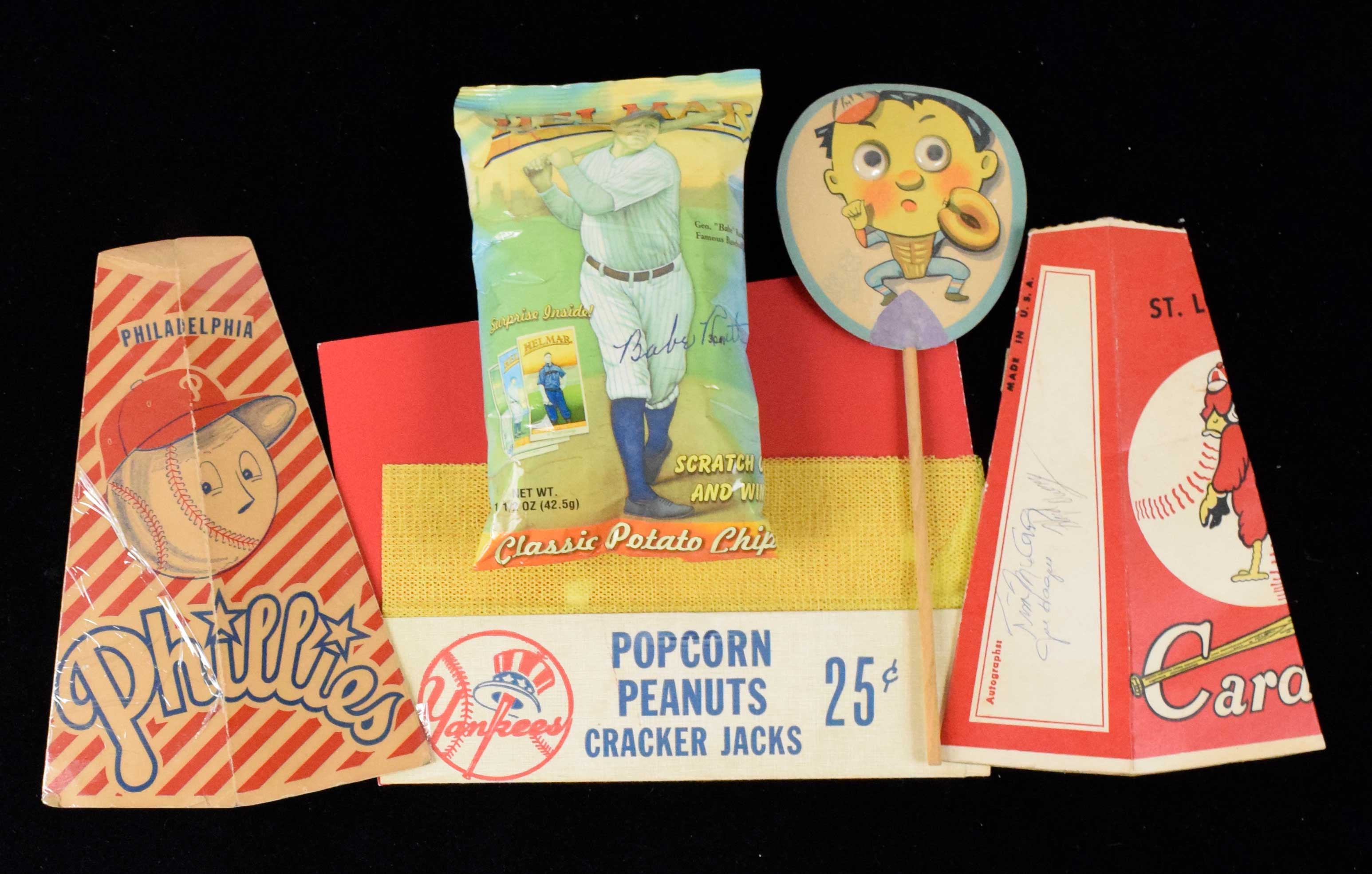 Description:Box of vintage and modern baseball memorabilia, including (14) vintage popcorn megaphones (GD-NM). Nice assortment of baseball memorabilia, highlighted by (14) c. 1950s-1970s vintage popcorn megaphones (all flattened and wrapped in cellophane (removable). Includes Braves (with ticket stub), Red Sox, (2) Senators, (2) Orioles (one autographed by Jim Palmer and others) , Brewers, Astros, Pirates, Pilots, (2) Cardinals (one is autographed by Tim McCarver and others); (1) White Sox and (1) Phillies. Other items include vintage stadium peanut vendor hat; vintage stadium drinking cups, vintage Orioles popcorn container; Phillies Citizen's Bank Park popcorn container; 2013 All-Star game popcorn container; vintage Japanese baseball player fans; 2005 MLB plastic drinking cup signed by Larry Bowa and Bill Monbouquette and other plastic cups; 2003 bag of Helmar Babe Ruth potato chips, Seattle Pilots bumper sticker, Los Angeles Angels bag and more. Range: GD-NM