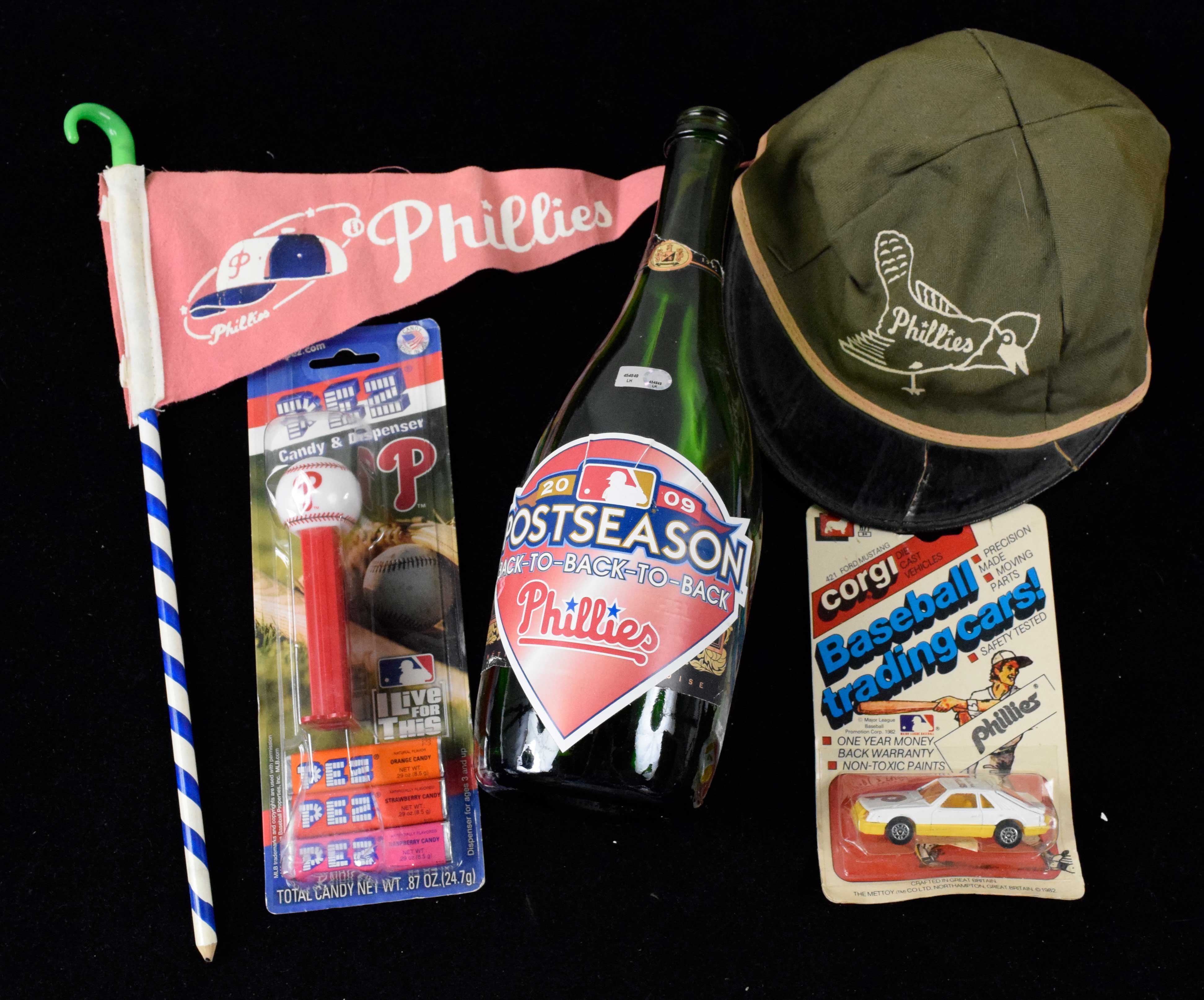 Description:Box of assorted vintage and modern Phillies memorabilia, including 2009 Postseason champagne bottle (VG-NM). Assortment of mostly smaller and modern memorabilia should appeal to Phillies collectors. Highlights include 2009 Phillies Postseason champagne bottle with MLB Authentication sticker (Oct. 1, 2009; day after the Phillies clinched the N.L. East); c. 1930s Phillies cap; (2) Modell's Citizen's Bank Park 2004 Opening Day souvenir balls and other souvenir balls; 1982 Phillies Corgi diecast vehicle in original packaging; Mike Schmidt memorabilia, including Mike Schmidt Night program and Hall of Fame induction program; (4) 2004-05 Phillies ticket stubs; c. 1960s Phillies pencil pennant; 2008 World Series plastic sippy cup; Phillies-themed gumball dispenser and other candy dispensers; Phillies team matches in original packaging; Phillies book cover in original packaging; Pez dispensers in original boxes, modern pins, buttons, foam finger and more plus numerous small other tchotchkes. Range: VG-NM.