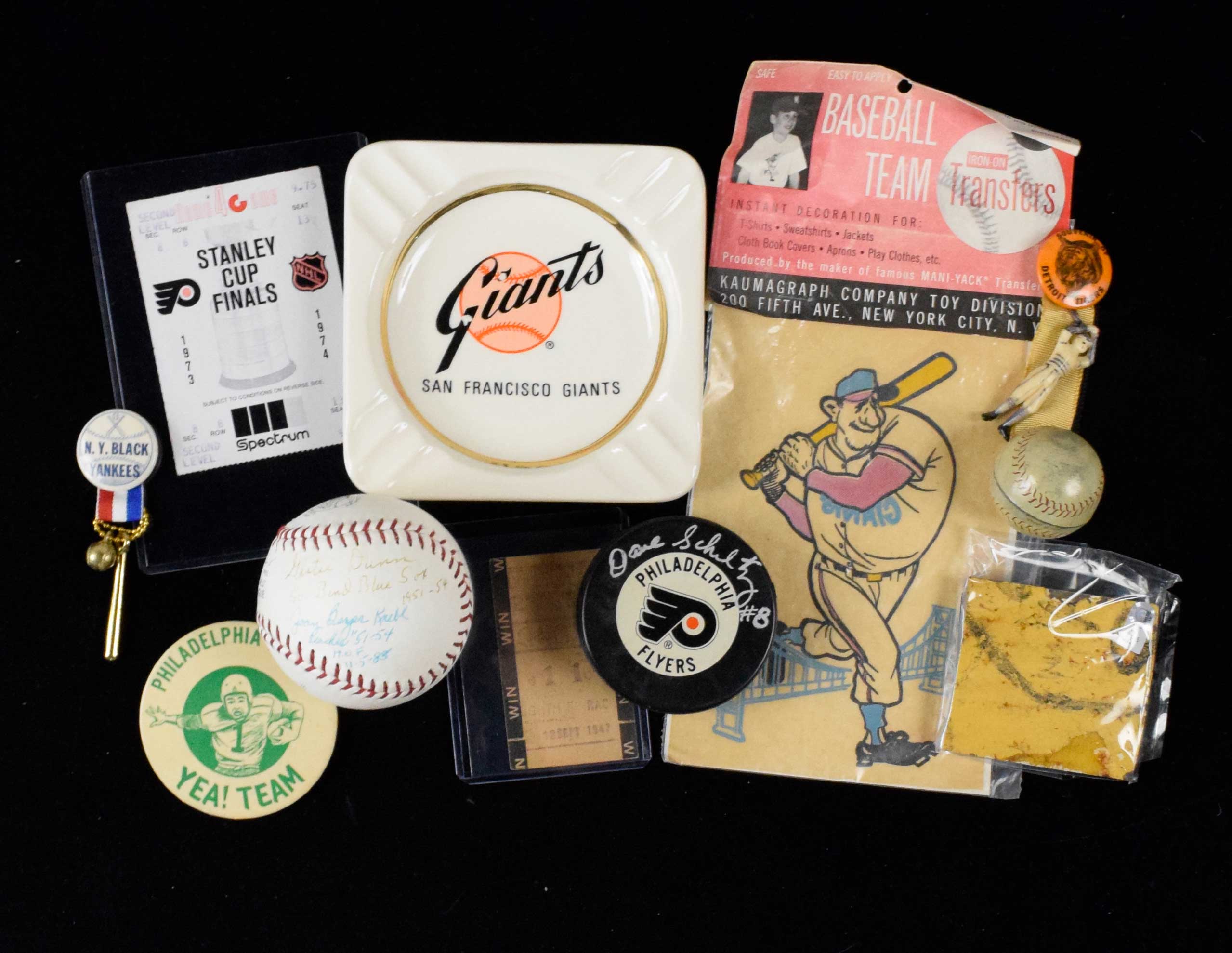 Description:Box of assorted sports memorabilia, including Yankee Stadium foul pole piece, vintage pins and autos (VG-NM). Eclectic assortment of mostly baseball and football memorabilia, with many nice vintage pieces and some autographs. Highlights include a piece of Yankee Stadium right field foul pole (1923-2008) with MLB Authentication sticker affixed and Steiner COA; 1973-74 Philadelphia Flyers Stanley cup Finals Game 4 ticket stub signed on the reverse by Bernie Parent, Dave Schultz, Joe Watson, Bob Kelly, and Bill Clement; c. 1940s N.Y. Black Yankees pin with charm; All American Girls Baseball League baseball signed by (5), including Gertie Dunn, Joan Berger Knebl, Alice Deschaine and Ruth Richard; c. 1960s San Francisco Giants and Los Angeles Dodgers (Dodgers has chip/piece missing) ashtrays; c. 1960s Kaumagraph S.F. Giants Baseball Team Transfer in original packaging; Sept. 18, 1947 Garden State Park Racetrack "Win" ticket stub; 1981 Philadelphia Eagles full-size NFC Champs pennant; 1960 Fleer football 11-card panel uncut sheet (commons and minor stars); Philadelphia Flyers logo puck signed by Dave Schultz; vintage Eagles button and 2017 Eagles replica Super Bowl ring; sports card show flyer signed by Jon Matlack; c. 1950s Detriot Tigers pin with charm, plus numerous other souvenir pieces and small modern tchotchkes. Signatures range from 7/8 out of 10 and items range GD-NM.
