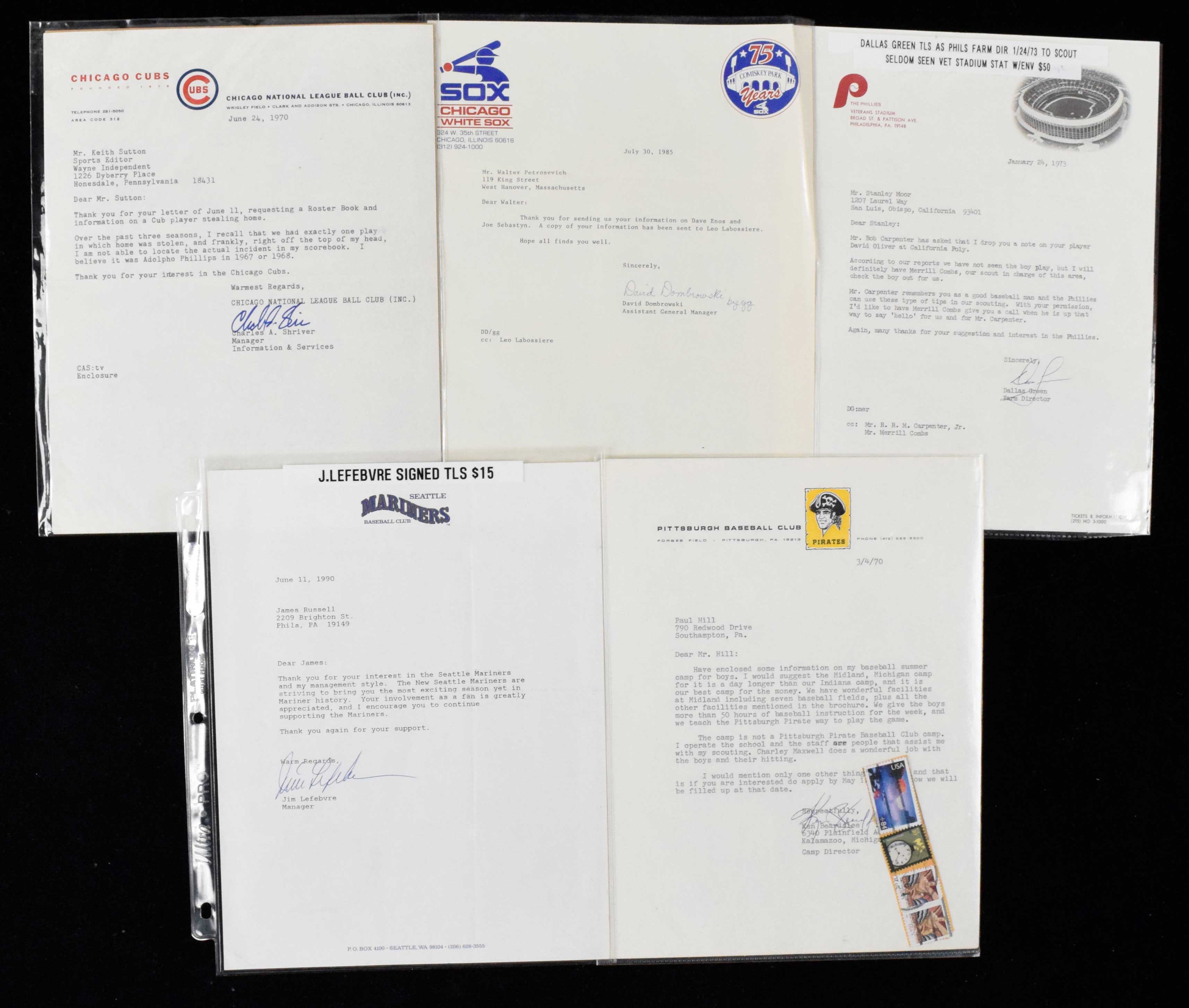 Description:Lot of (14) 1970-1990 original MLB team letters, including Pirates, Phillies and Cubs (VG/EX-NM). Outstanding collection of original vintage team letterheads, many of which are signed - though the lot is being offered as stationery only as the signatures are likely secretarial and/or too obscure to verify as authentically signed. Highlights include (1) June 11, 1990 letter on Seattle Mariners stationery from Jim Lefebvre; (1) April 6, 1981 letter on San Francisco Giants stationery from John S. Schwarz; (1) March 4, 1970 letter on Pittsburgh Pirates stationery from Ken Beardslee; (1) Jan. 24, 1973 letter on Philadelphia Phillies stationery from Dallas Green; (1) Feb. 18, 1987 letter on Montreal Expos stationer from David Dombrowski; (1) Jan. 28, 1981 letter on Kansas City Royals stationery from Howie Bedell; (1) July 30, 1985 letter on Chicago White Sox stationery from David Dombrowski; (1) June 24, 1970 letter on Chicago Cubs stationery from Charles Shriver; and several other letters. Letters: VG/EX-NM (with note on secretarial signatures).