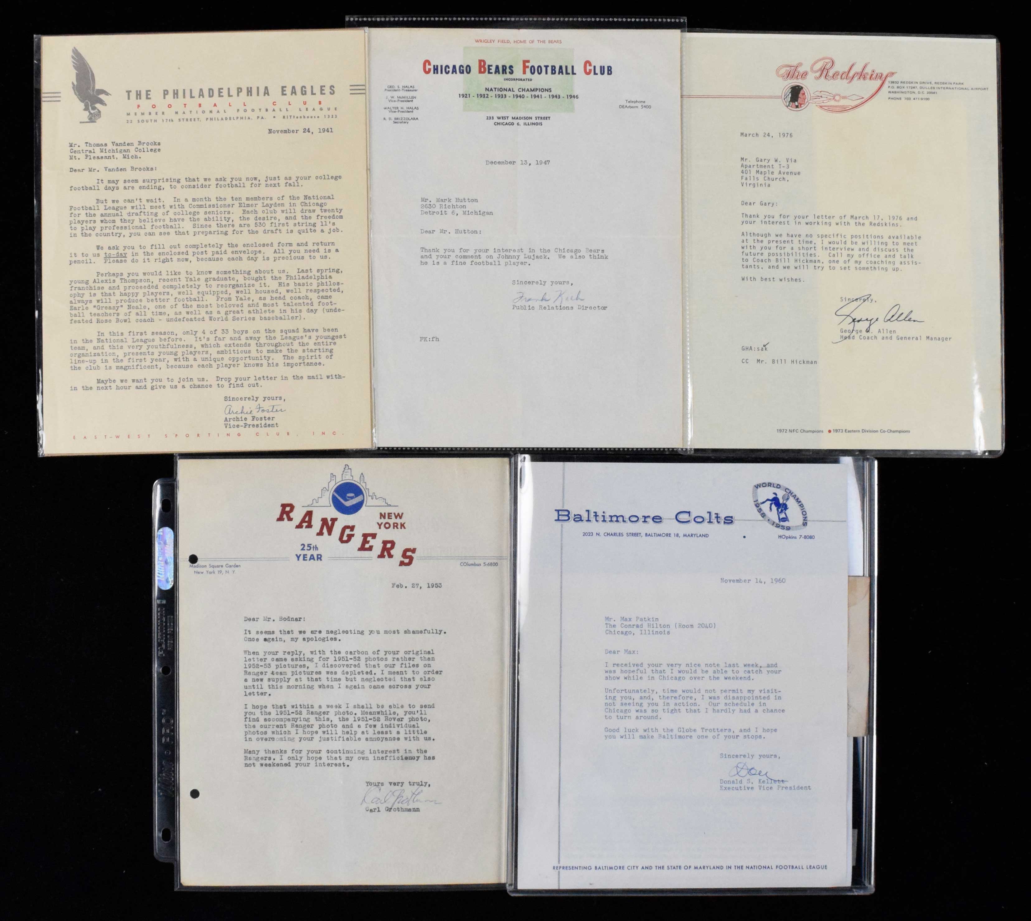 Description:Lot of (17) 1941-1976 original NFL, NHL and NBA team letters, including Colts, Eagles and Bears (VG/EX/MT). Outstanding collection of original vintage team letterheads, many of which are signed - though the lot is being offered as stationery only as the signatures are likely secretarial and/or too obscure to verify as authentically signed. Includes (15) NFL team letters, highlighted by (1) March 24, 1976 letter on Washington Redskins stationery from George Allen; (1) Nov. 24, 1941 letter on Philadelphia Eagles stationery from Archie Foster; (1) Oct. 5, 1976 letter on New York Jets stationery from Lou Holtz; (1) Jan. 14, 1947 letter on Cleveland Browns letterhead from Nathan Wallack; (1) Aug. 22, 1945 letter on Cleveland Rams stationery from Bill John; (1) Dec. 13, 1947 letter on Chicago Bears stationery from Frank Kach; (1) Nov. 14, 1960 letter on Baltimore Colts stationery from Donald S. Kellett and other letters. Also included are (1) NHL: Feb. 27, 1953 letter on N.Y. Rangers stationery from Carl Grothmann and (1) NBA: (1) 1971 letter on Boston Celtics stationery from the Celtics. Letters: VG/EX/MT(with note on secretarial signatures).