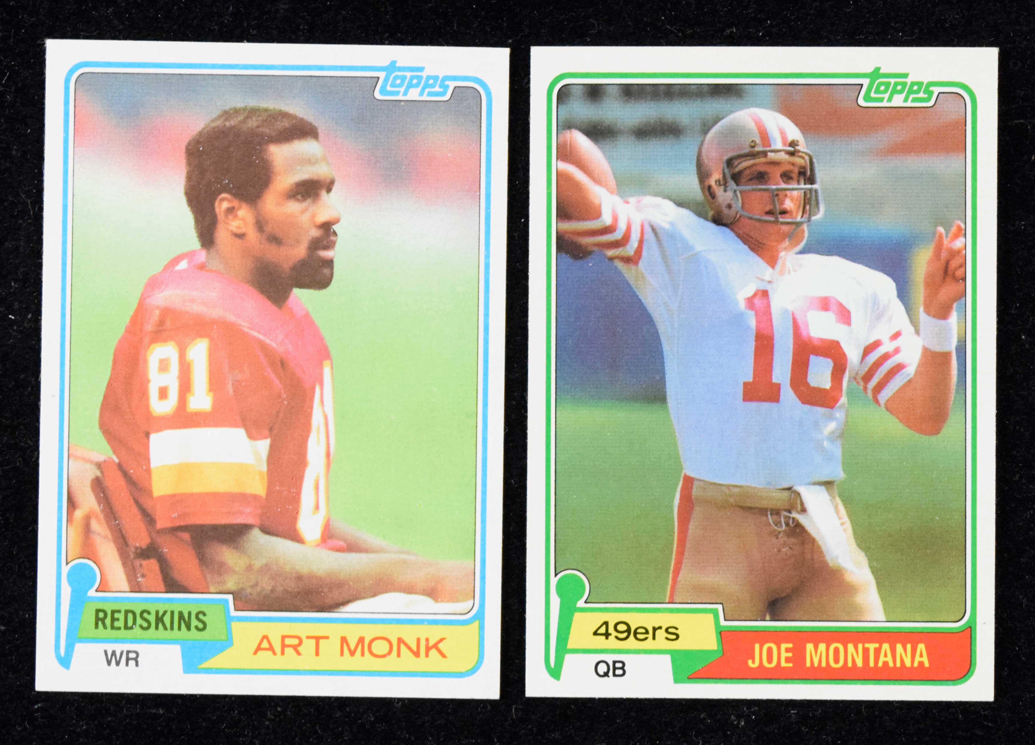 Description:Lot of (2) high-grade 1981 Topps FB RCs, with Joe Montana and Art Monk (NM-NM/MT+). Sharp lot of key rookies from the 1981 Topps football set, with #s 194 Art Monk (NM/MT+) and 216 Joe Montana (NM). Range: NM-NM/MT+.