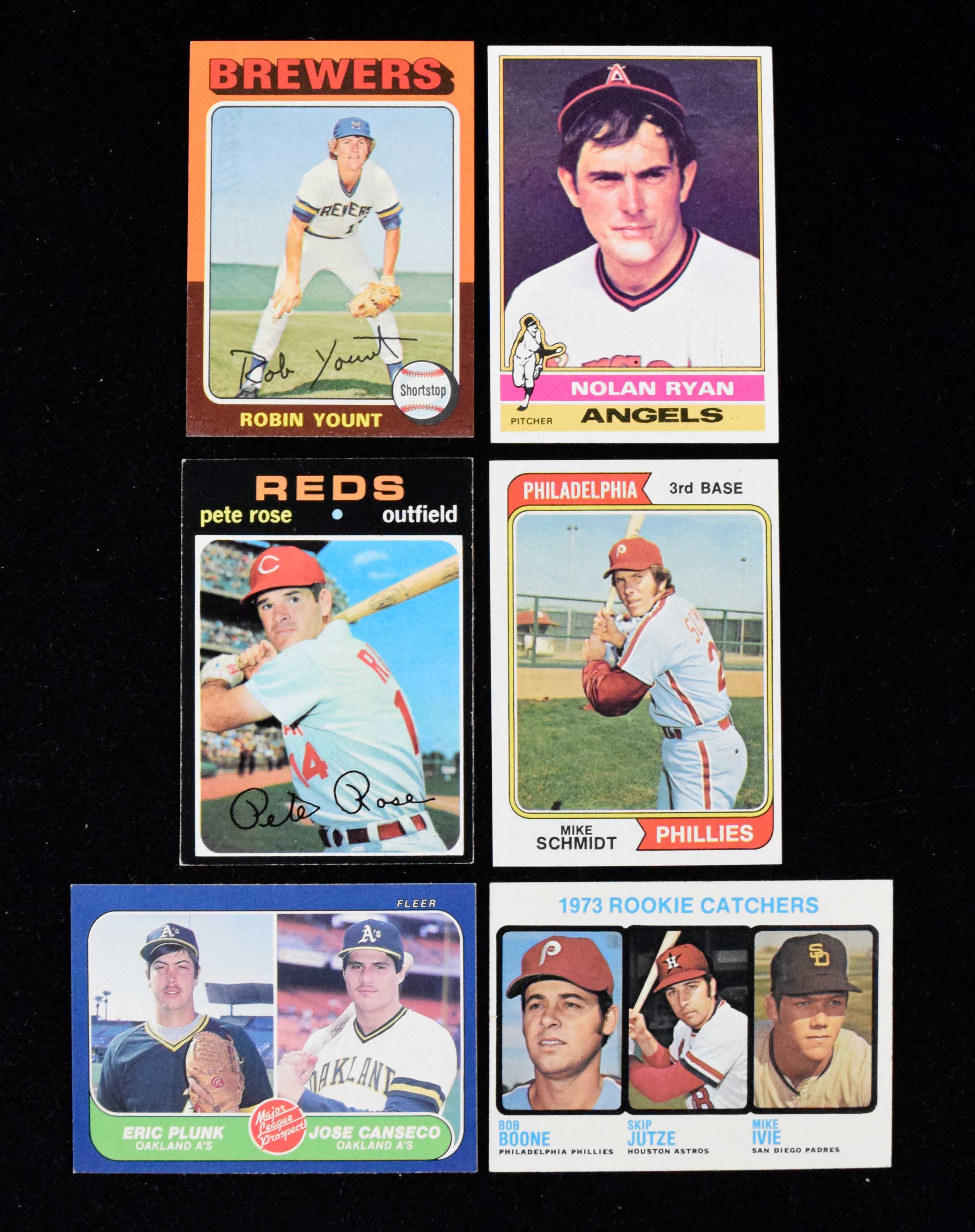 Description:Clean lot of (6) 1971-1986 stars and RCs, including Rose, Ryan, Yount and Schmidt (EX-NM/MT OC). Sharp lot of key cards from the 1970s and 1980s, with 1971 Topps #100 Pete Rose (EX), 1973 Topps #613 Bob Boone RC (EX/MT OC), 1974 Topps #283 Mike Schmidt (NM/MT OC), 1975 Topps #223 Robin Yount RC (NM), 1976 Topps #330 Nolan Ryan (NM), and 1986 Fleer #649 Jose Canseco RC (NM). Range: EX-NM/MT OC.
