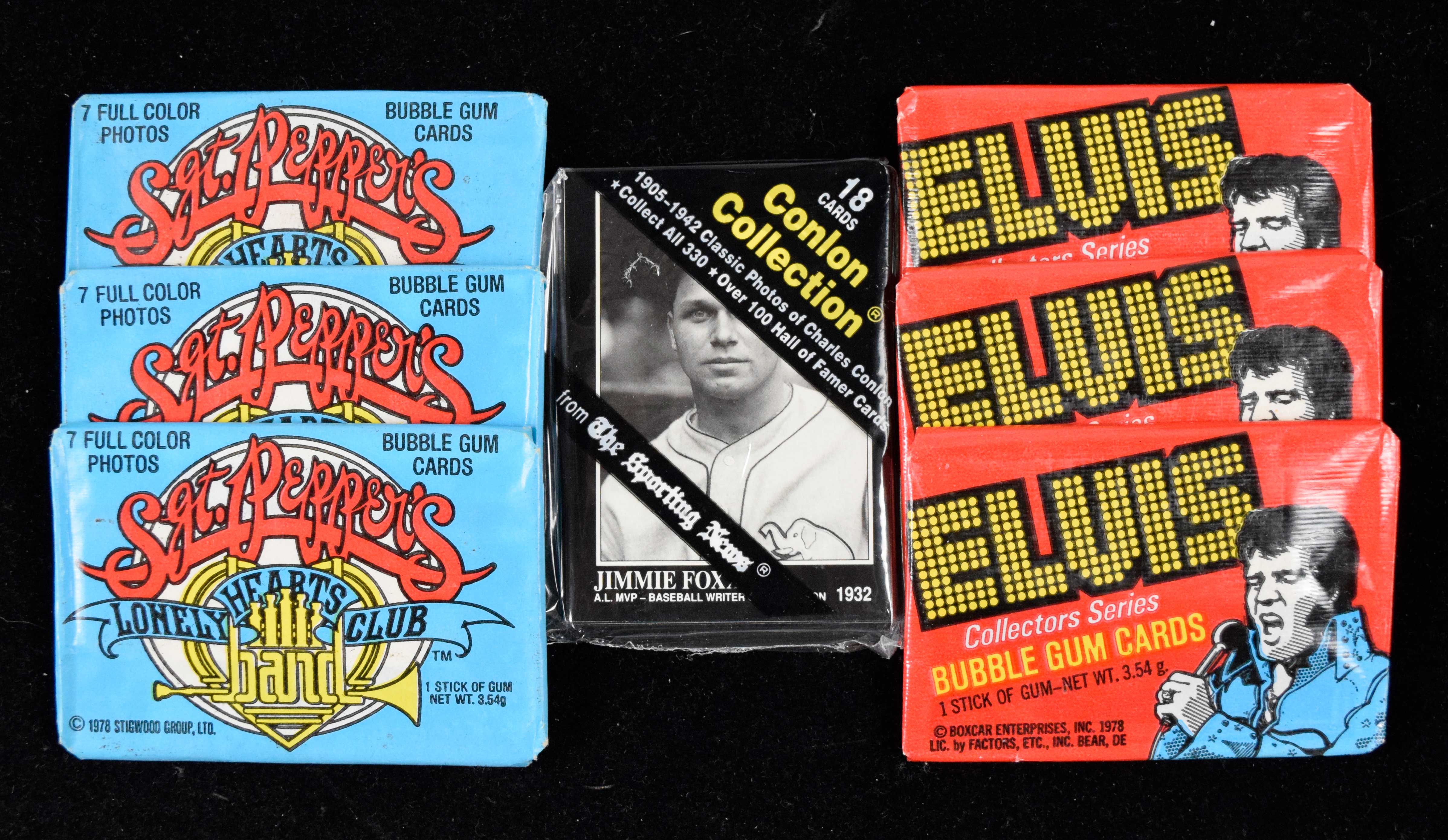 Description:Lot of (48) unopened sports and nonsports packs, including 1978 Elvis (VG/EX-NM). Includes (22) unopened 1978 Donruss Elvis (all sealed but some wrappers have wear at the corners; VG/EX); (14) unopened 1978 Donruss Sgt. Peppers Lonely Hearts Club Band packs (all sealed but some wrappers have wear at the corners; VG/EX); (12) unopened 1991 Conlon Collection unopened packs (NM), as well as some loose Elvis, Sgt. Peppers cards and modern Babe Ruth reprint cards. Range: VG/EX-NM.