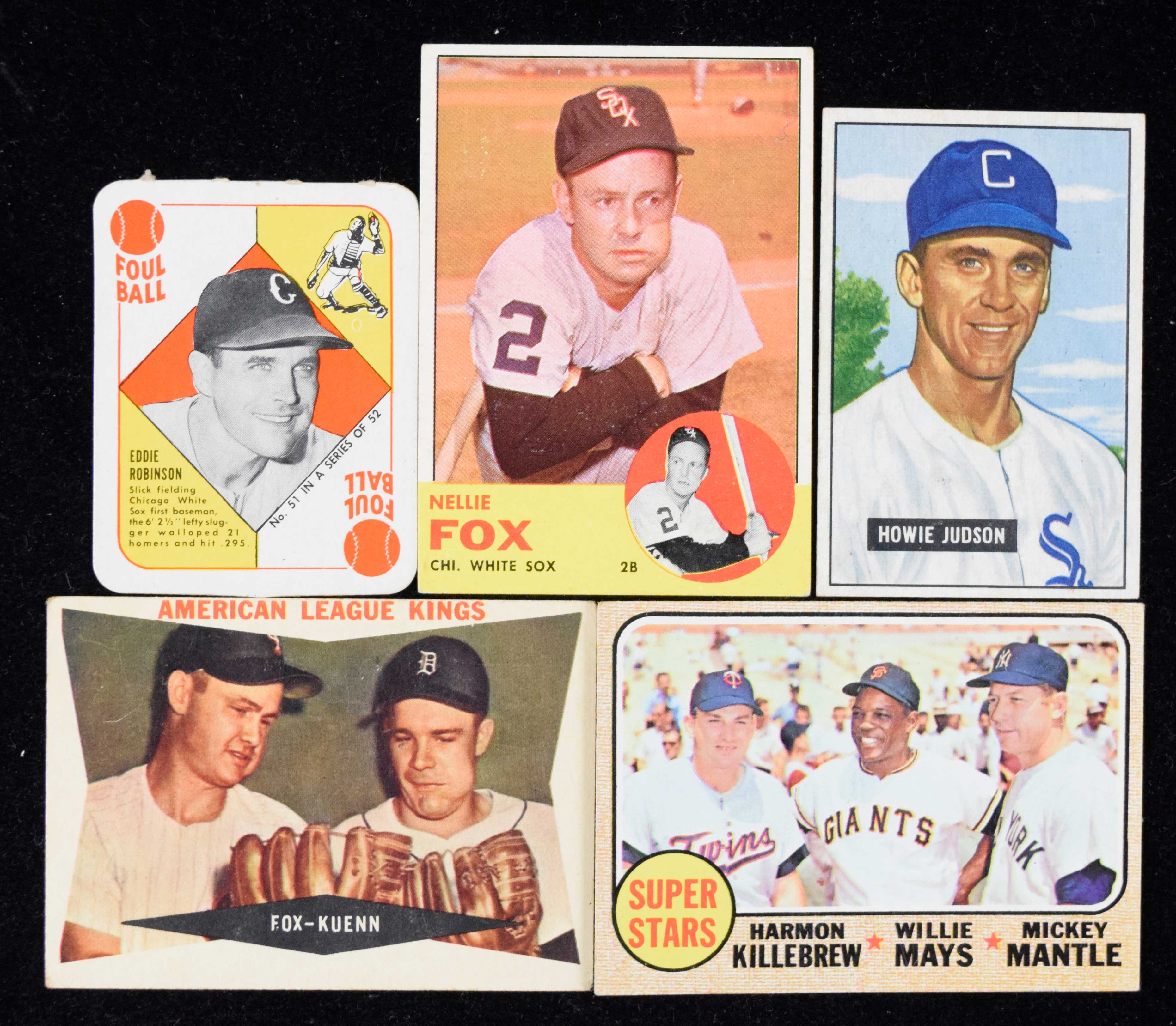 Description:Lot of (5) 1951-1968 Topps & Bowman cards, including Mantle and Fox (VG-EX/MT). Good assortment of vintage cards, most featuring White Sox. Includes 1951 Bowman #123 Howie Judson (EX/MT), 1951 Topps Red Backs #51 Eddie Robinson (VG), 1960 Topps #429 Nellie Fox/Harvey Kuenn (VG), 1963 Topps #525 Nellie Fox (VG) and 1968 Topps #490 Mickey Mantle/Willie Mays/Harmon Killebrew (EX). Range: VG-EX/MT.