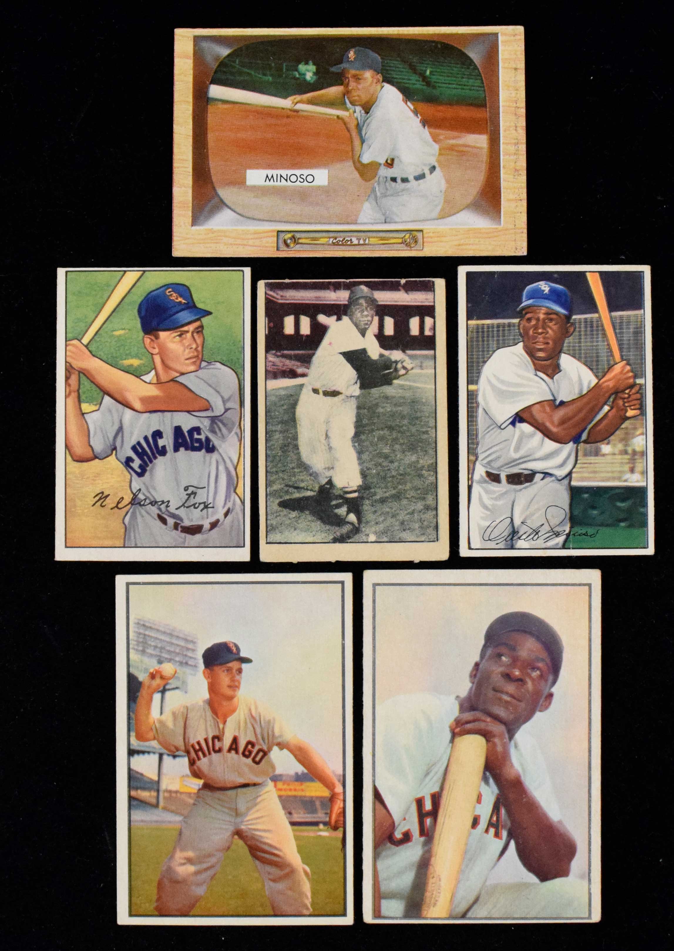 Description:Lot of (67) diff. 1952-1955 Bowman, Berk Ross Chicago White Sox cards with Minoso RCs (FR-NM). Outstanding lot appears to be near-complete 1952, 1953, 1954 and 1955 Bowman and 1952 Berk Ross Chicago White Sox team sets, with (14) 1952 Bowman cards, including #s 21 Nellie Fox (EX/MT OC) and 5 Minnie Minoso RC (GD); (4) 1952 Berk Ross, including Minnie Minoso RC (VG; miscut); (11) 1953 Bowman Color cards, including #s 36 Minnie Minoso (VG) and 18 Nellie Fox (GD); (14) 1954 Bowman cards, including #s 38 Minnie Minoso (EX/MT) and 6 Nellie Fox (VG) and (24) 1955 Bowman cards, including #s 25 Minnie Minoso (VG/EX), and 33 Nellie Fox (VG/EX) and 213 George Kell (EX). Most cards appear VG/EX-EX. Range: GD-EX/MT.