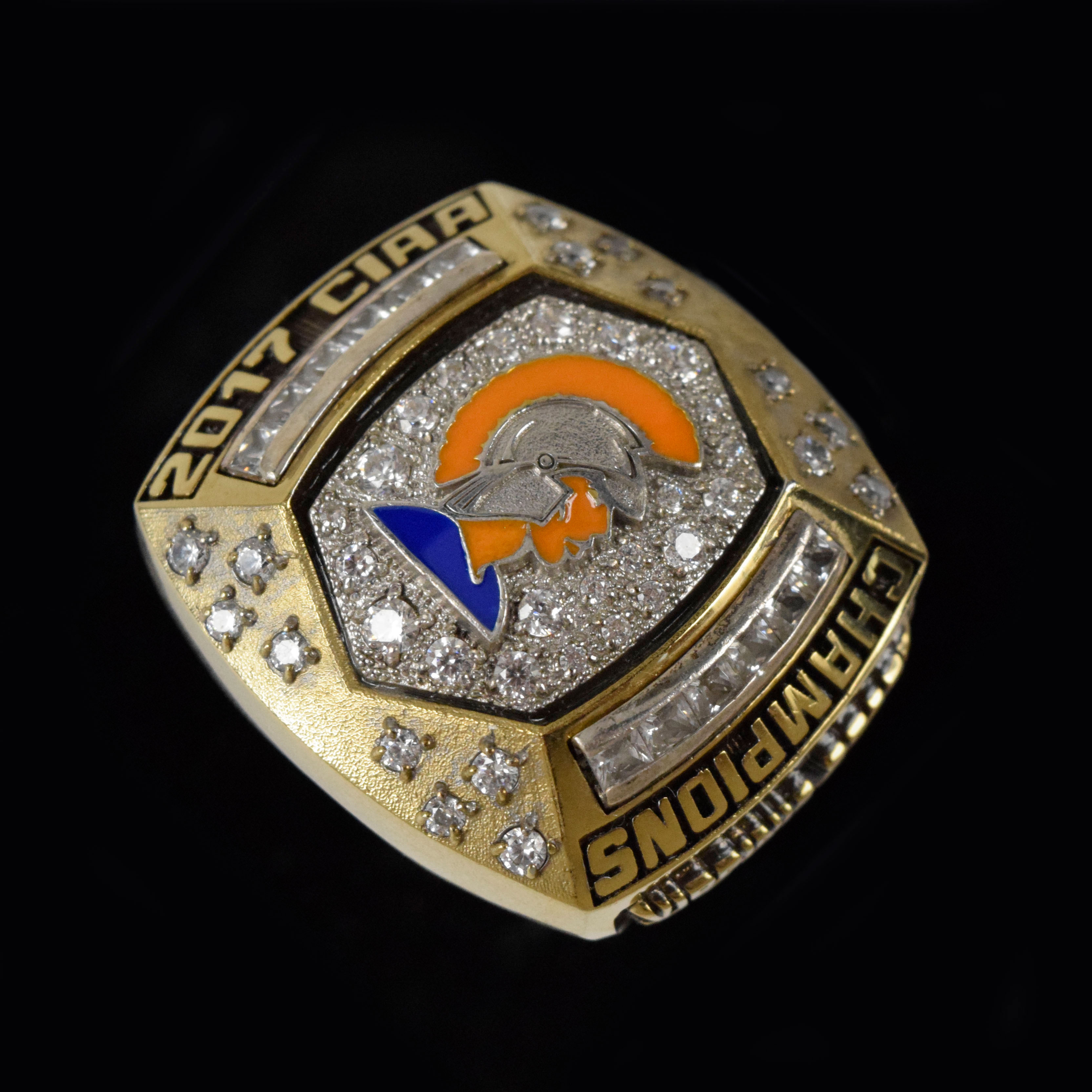 Description:2017 Virginia State Trojans CIAA Champions ring (NM). Size 8 ring with team logo surrounded by faux diamonds on the face, and "2017 CIAA" at the left and "CHAMPIONS" to the right. One side has "JOHNSON" above #2 helmet with "QB" below (Niko was the team's starting QB). The other side has "Virginia State Trojans" above a trophy with "10-0" record below. "One Team - One Dream" is etched inside the band above the Balfour stamp: NM