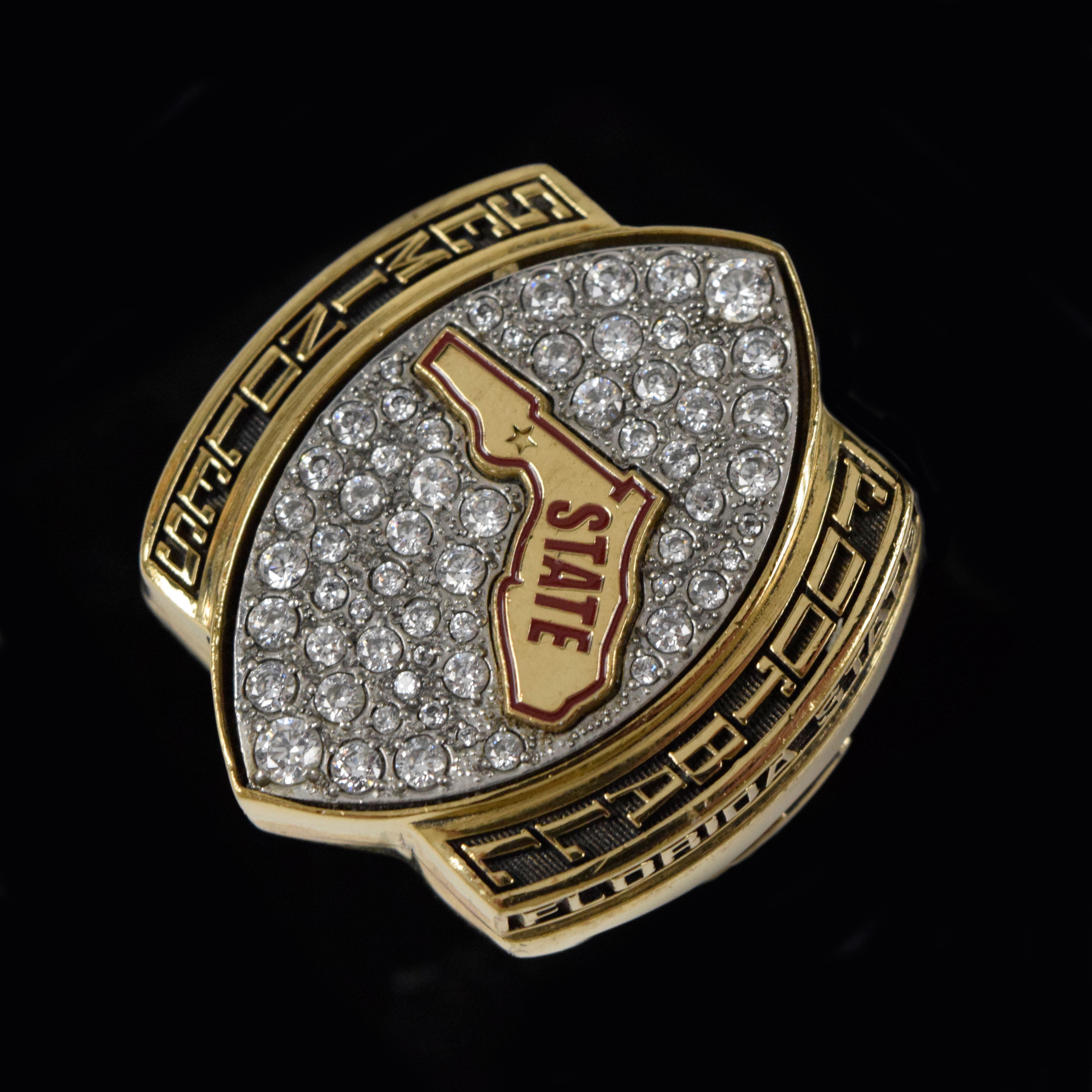 Description:Florida State Seminoles 2015 state champions / Peach Bowl ring (EX/MT). Size 8 ring presented to Ja'Vonn Harrison with one side having his name above a Florida State helmet and #13 below "Chick-Fil-A Peach Bowl" text above Harrison's name). The opposite side has "State Champions" text along with the scores of their game vs Miami and Florida. The face shows an array of CZ stones surrounding the state of Florida, and Harrison's name is etched inside the band along with Jostens marks. Minor wear: EX/MT