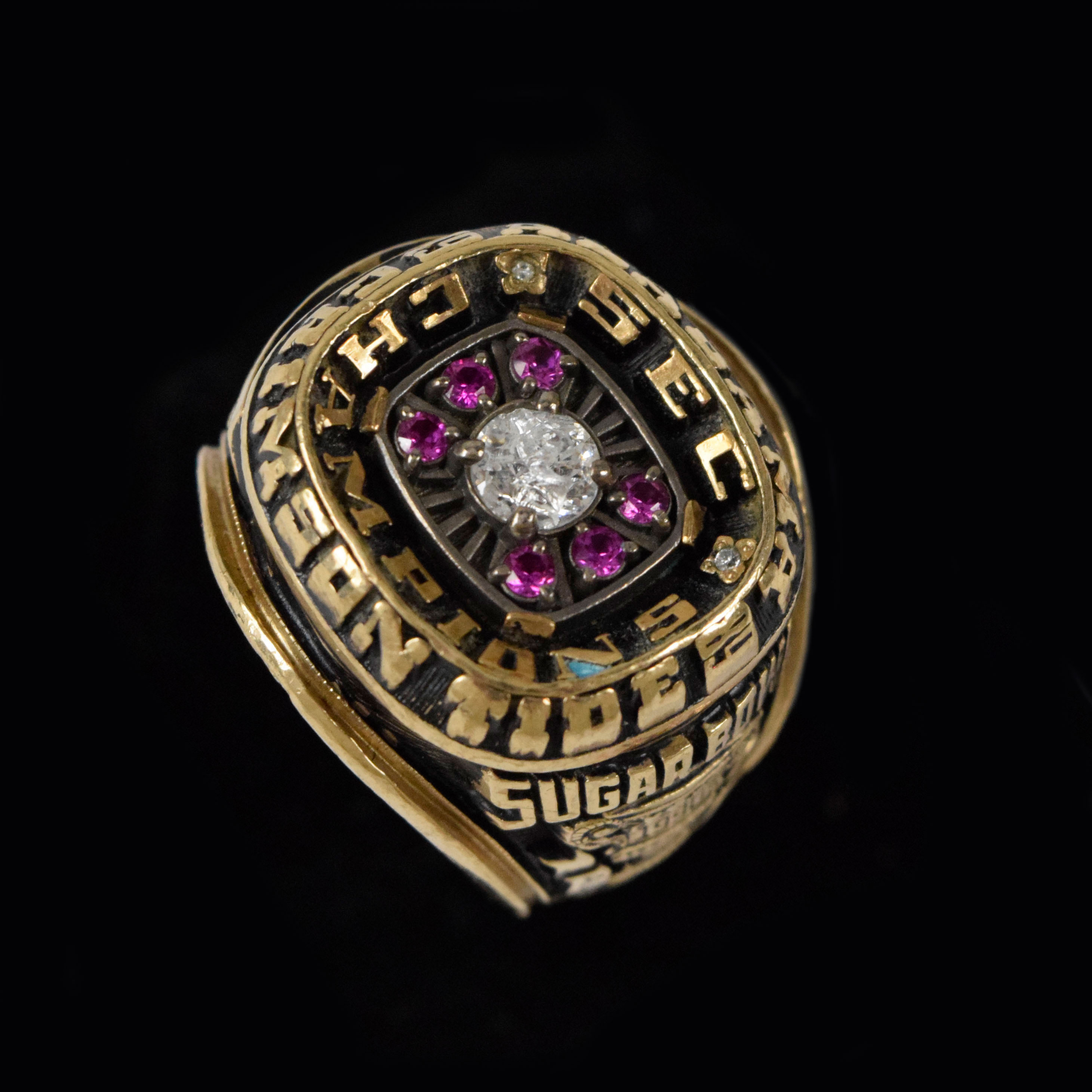 Description:1989 Alabama Crimson Tide SEC Champions 10-K gold ring (EX/MT). Size 10 ring with six ruby stones surrounding a faux diamond at the center, along with "SEC Champions" "1989 Alabama Crimson Tide" text around the edges. One side has "Campbell CB" above a #38 helmet with "10-2" record below (Mike Campbell), and the opposite side has a 1990 Sugar Bowl design. "JOSTENS 10K" is stamped inside the band. Weighs 8-tenths of an ounce. Minor residue inside the crevices: EX/MT