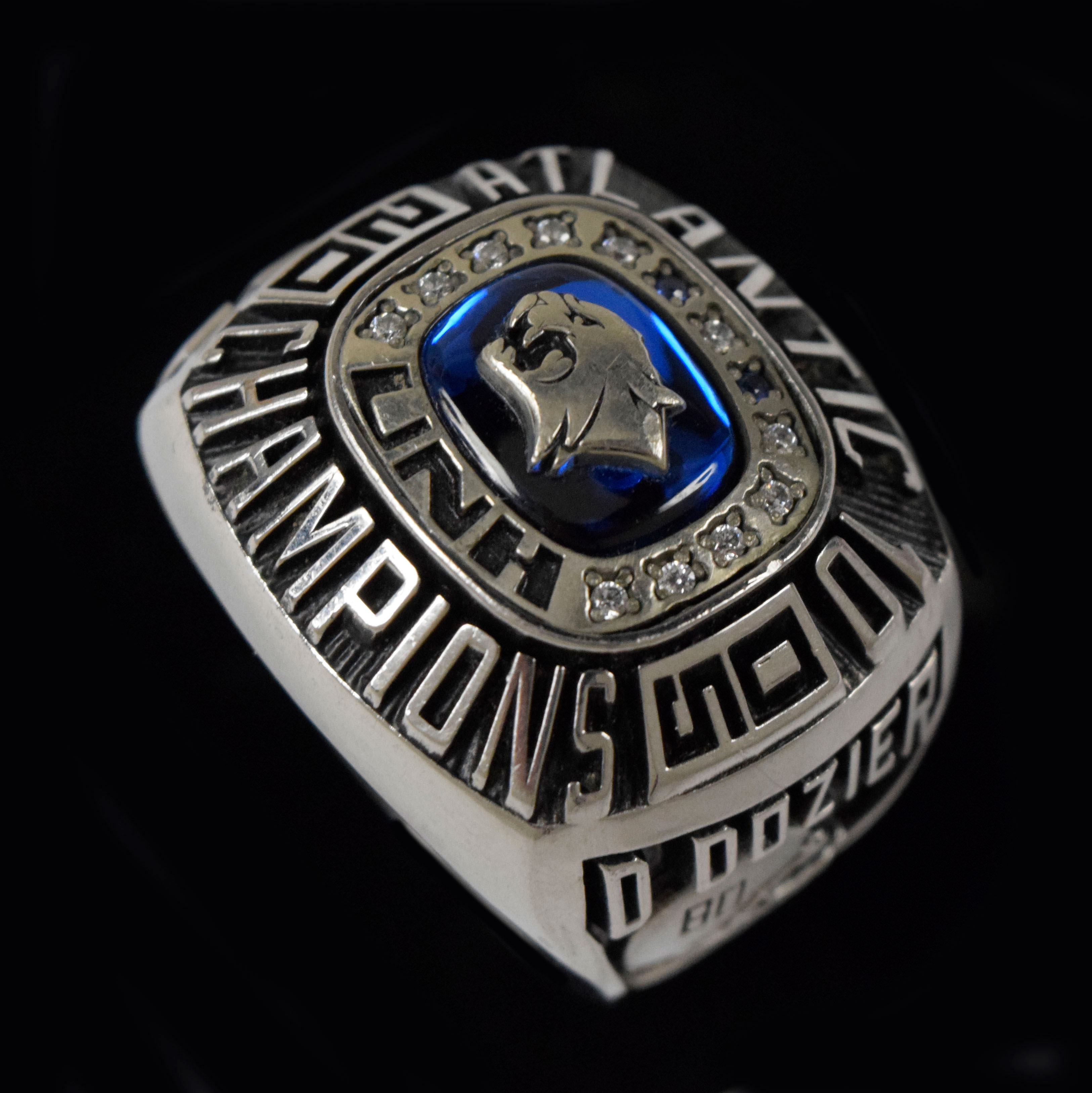 Description:New Hampshire Wildcats 2005 Atlantic 10 Champions ring (EX/MT). Size 11 ring showing the team logo on the face surrounded by faux diamonds with "2005 Atlantic 10 Champions" text around the edges. One side has "NCAA Playoffs" text above team logo with "11-2" record below. The opposite side has "D DOZIER" above #80 helmet with "WR" below. "Devin Dozier" is etched inside the band above Balfour stampings. Minor wear: EX/MT