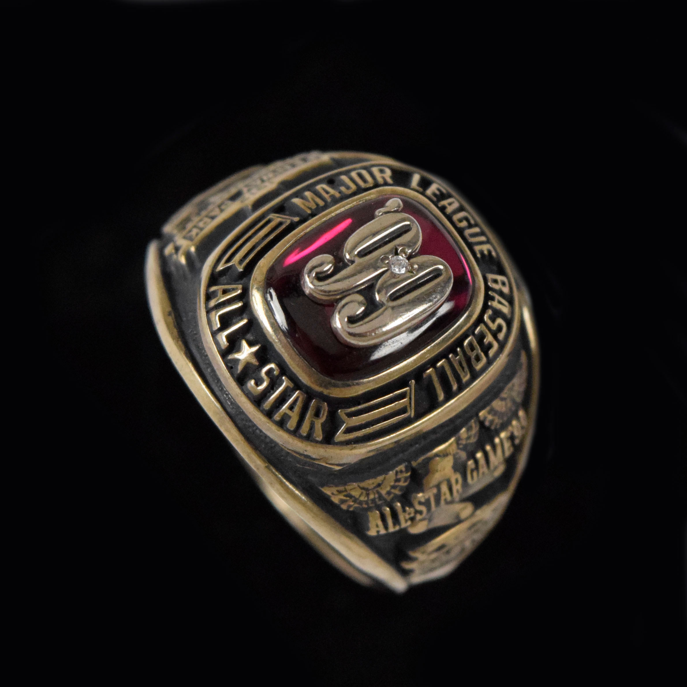 Description:1999 MLB All-Star Game presentational ring (EX/MT). Size 9.5 ring with CZ stone inside "99" on the face which is surrounded by "Major League Baseball" "All-Star" text. Fenway Park image and American League logo on one side, 1999 All-Star Game logo on the opposite side, and Jostens stamping inside the band. Minor wear: EX/MT