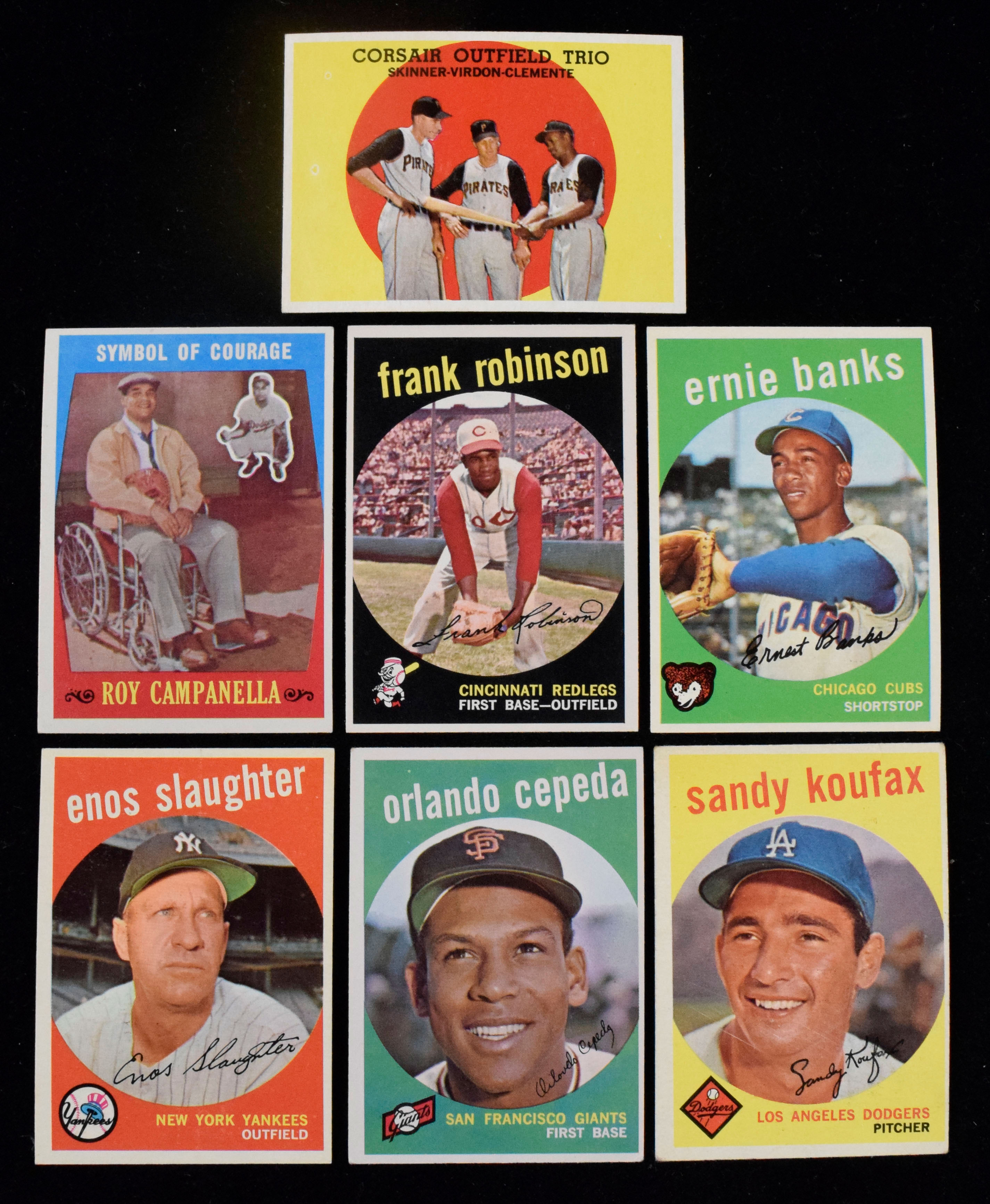 Lot of (10) 1959 Topps HOFers, including Koufax, Campanella and Robinson (VG-EX/MT). High-value lot of key cards from the 1959 Topps set, with #s 390 Orlando Cepeda (VG/EX), 155 Enos Slaughter (EX), 163 Sandy Koufax (VG), 515 Harmon Killebrew (EX/MT), 550 Roy Campanella (EX/MT OC), 543 Corsair Trio with Clemente (EX/MT), 147 Cubs Clubbers with Banks (EX), 350 Ernie Banks (EX+), 435 Frank Robinson (EX/MT OC), and 20 Duke Snider (EX). Range: VG-EX/MT.