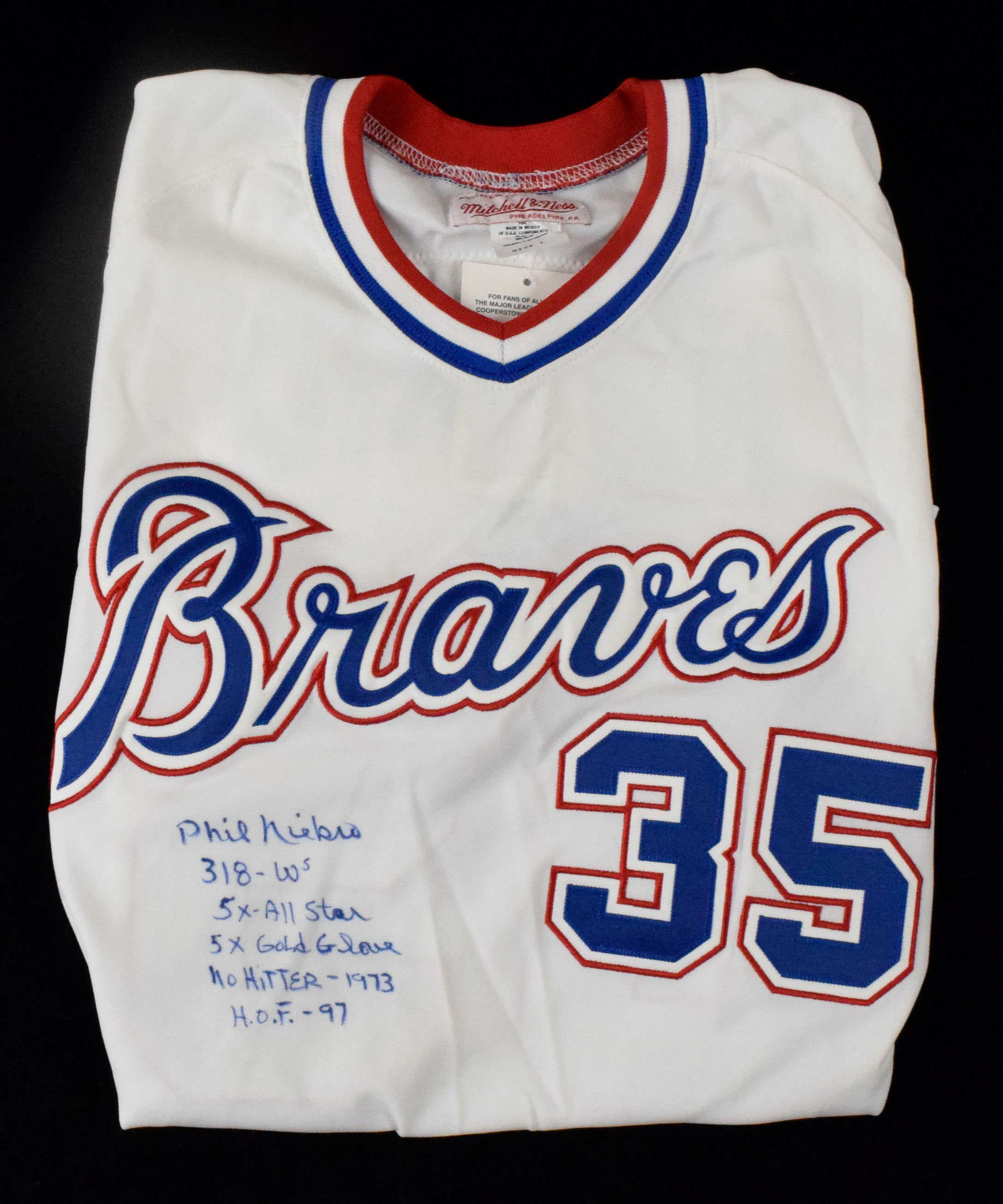 Description:Phil Niekro signed and multi-inscribed Atlanta Braves throwback jersey (NM). Mitchell & Ness "Cooperstown Collection" size L Braves #35 Phil Niekro 1981 style jersey signed by Niekro in blue marker with "318 - Ws" "5x All Star" "5x Gold Glove" "No Hitter 1973" "HOF 97" inscriptions. Signature rates 8/9 out of 10: NM