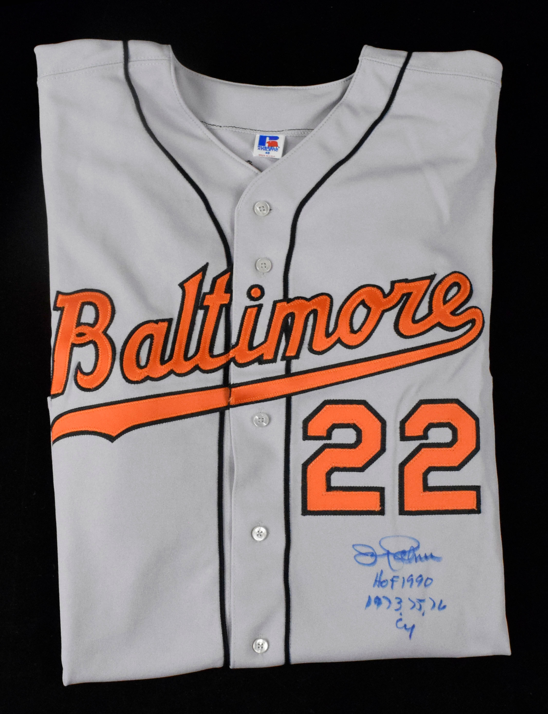 Description:Jim Palmer signed and inscribed Baltimore Orioles jersey (NM). Russell Athletic size 48 Orioles #22 Jim Palmer jersey signed by Palmer in blue marker with "1973, 75, 76 Cy" "HOF 1990" inscriptions. Signature rates 8/9 out of 10: NM