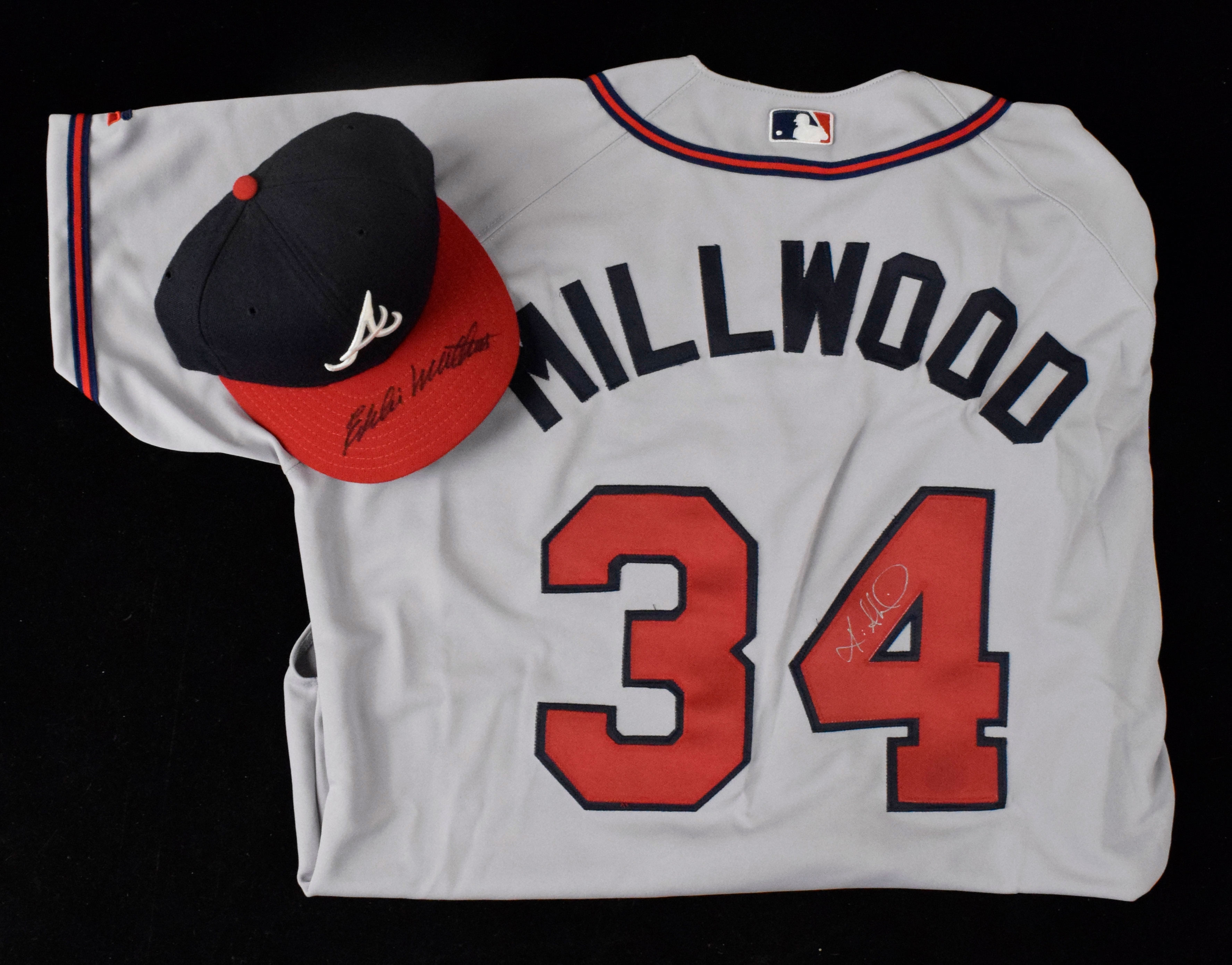 Description:Eddie Mathews signed Atlanta Braves hat & Kevin Millwood signed Braves jersey (NM-NM/MT). Includes a New Era size 7 Braves hat signed by Eddie Mathews in black marker (PSA/DNA), and Russell Athletic size 48 Braves #34 Kevin Millwood jersey signed by Millwood in silver marker. Signatures rate 8 to 8/9 out of 10: NM-NM/MT