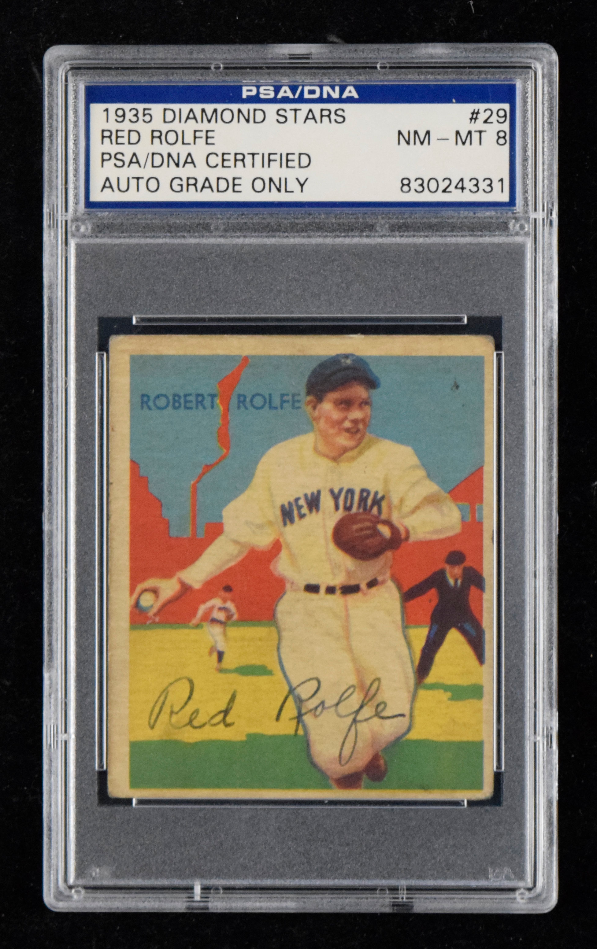 Description:1935 Diamond Stars #29 Red Rolfe autographed card (Sig. PSA NM-MT 8, Card FR) Signed in fountain pen with the autograph graded "8" by PSA. Card grades FR (far stronger appearance from the front) due to an ink mark and some other flaws on back: Sig. PSA NM-MT 8, Card FR