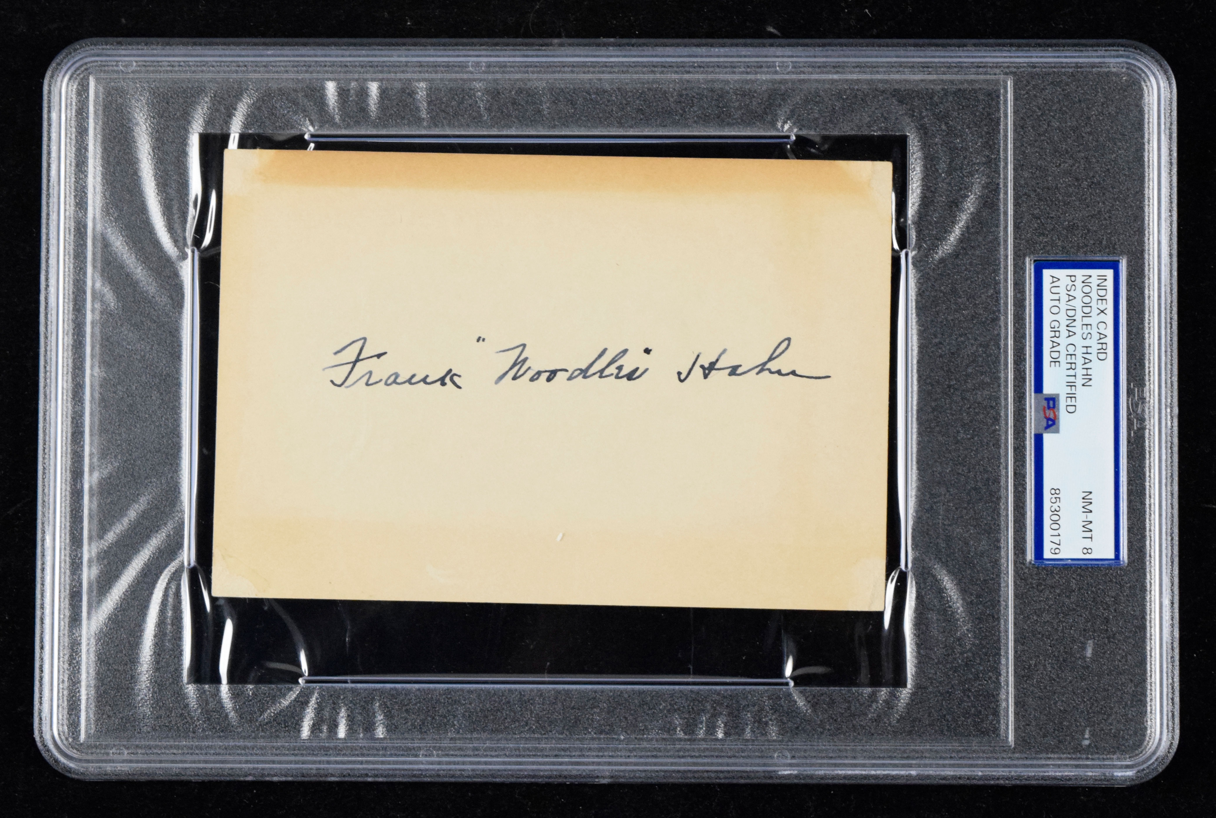 Description:Frank "Noodles" Hahn autograph (PSA NM-MT 8) Oversized 4"x6" index card has been signed in ink with the autograph graded "NM-MT 8." Light/mild toning and wear: PSA NM-MT 8