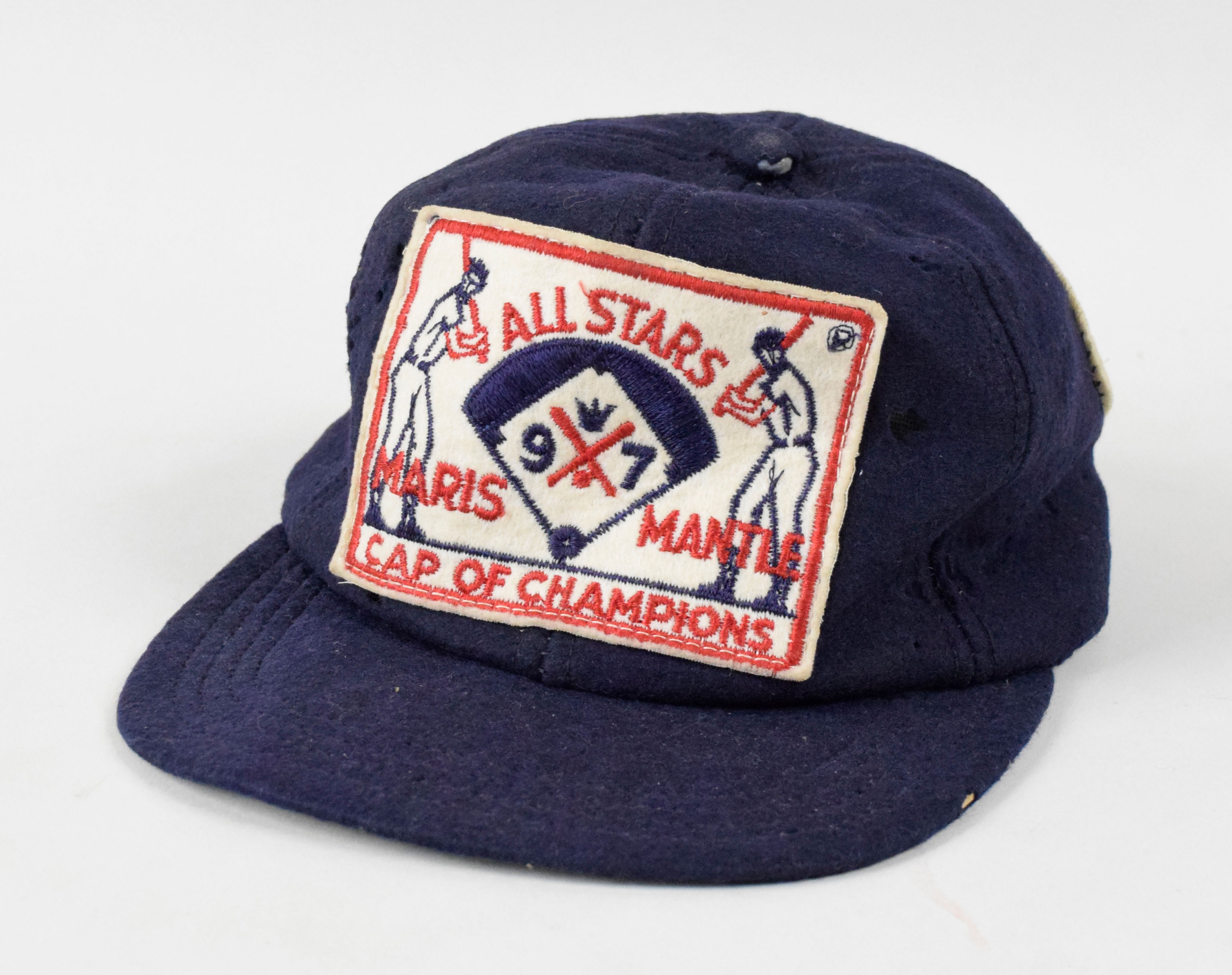 Description:Very sharp c.1961 Mickey Mantle and Roger Maris "Cap of Champions" hat (EX) Vintage hat has a "Maris Mantle All Starsâ?¦Cap Of Champions" patch on the front and (2) additional on the back (one related to each player). There is an "Official Mantle & Marisâ?¦" tag on the inside with 1961 copyright date. Outstanding display value with a few scattered flaws including moth holes: EX