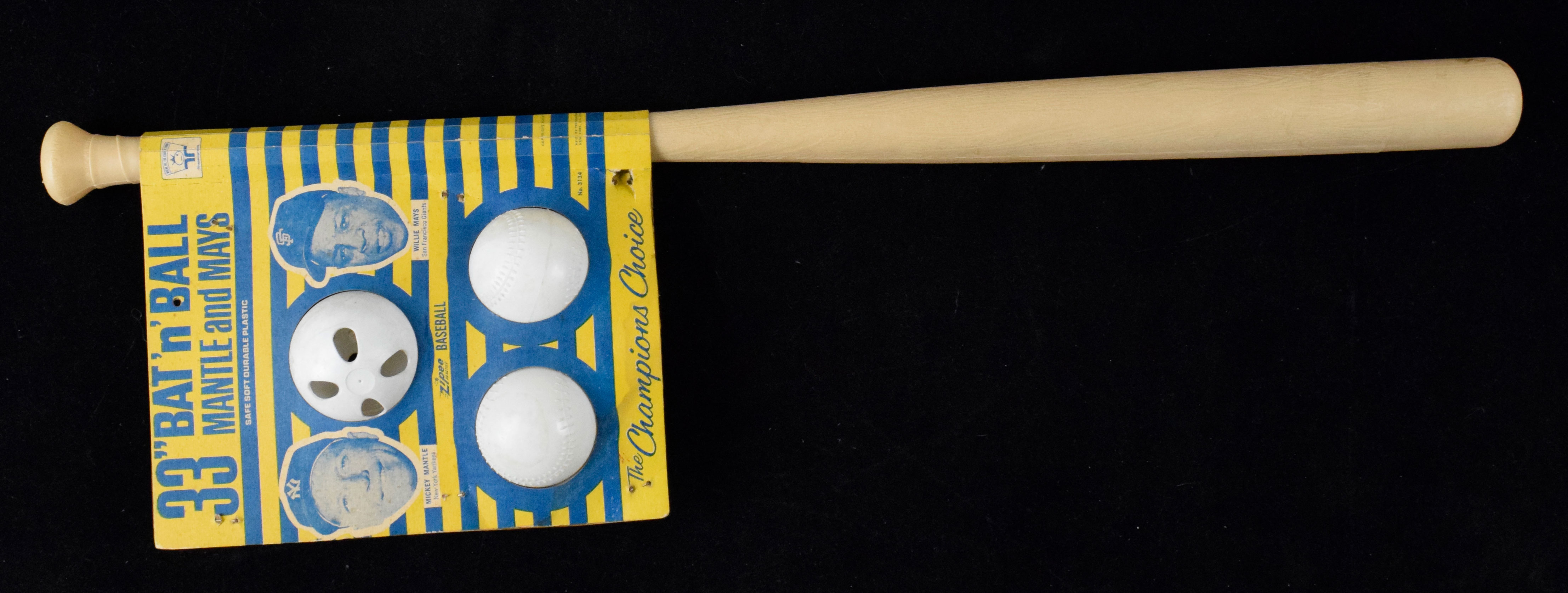 Description:c.1960s Mickey Mantle and Willie Mays endorsed bat and ball set in original packaging (EX) Molded plastic bat (33" long) has original heavy stock packaging attached which pictures Mantle and Mays promoting the the product which was made by Transogram. There are (3) plastic balls within the attached portion, one of which may be a replacement. Mild age and storage wear/toning: EX