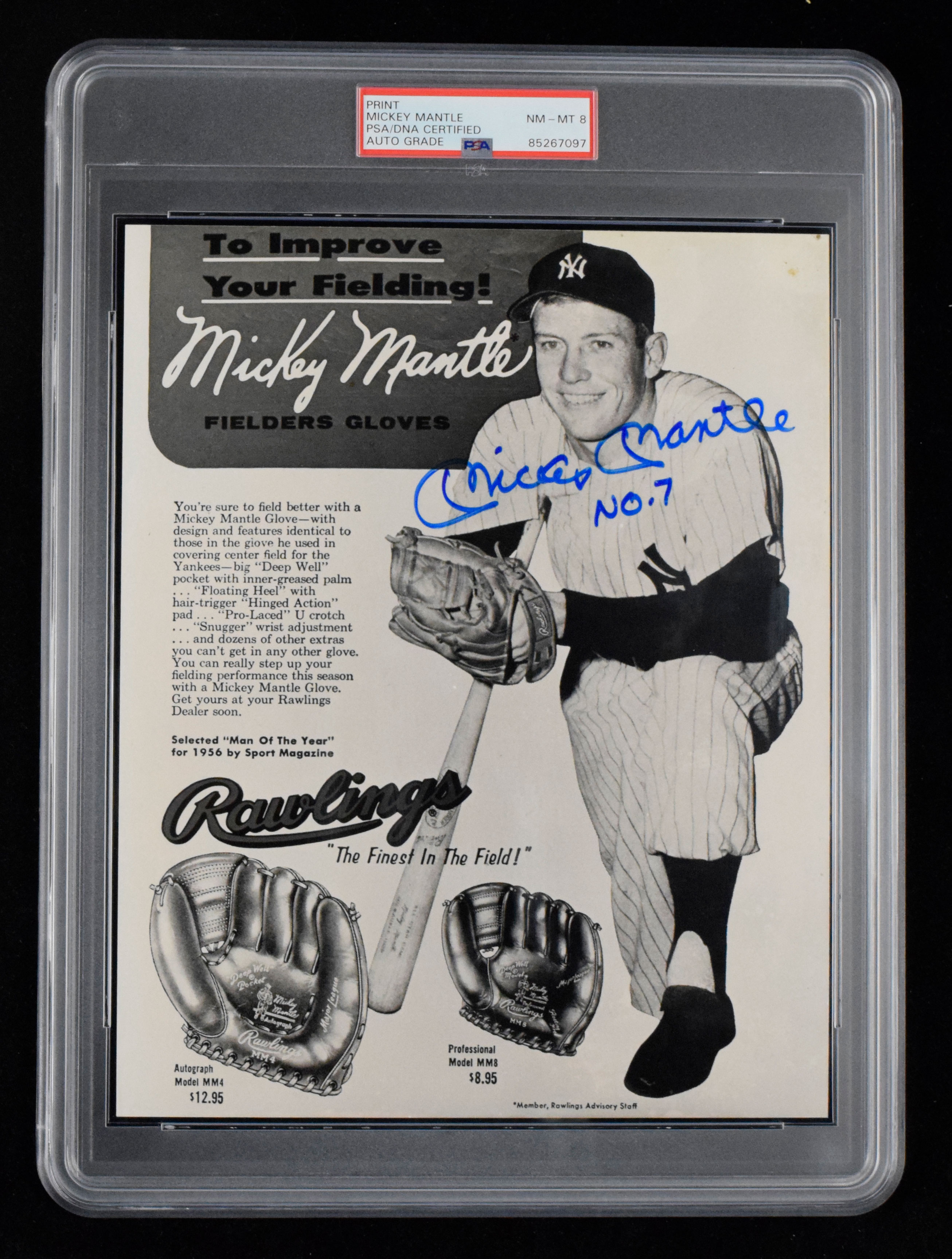 Description:Mickey Mantle autographed 8"x10" Rawlings advertising print (PSA NM-MT 8) Rawlings baseball glove ad printed on 8"x10" glossy photo stock has been signed in marker. Authenticated and encapsulated by PSA with the autograph graded NM-MT 8: PSA NM-MT 8 autograph