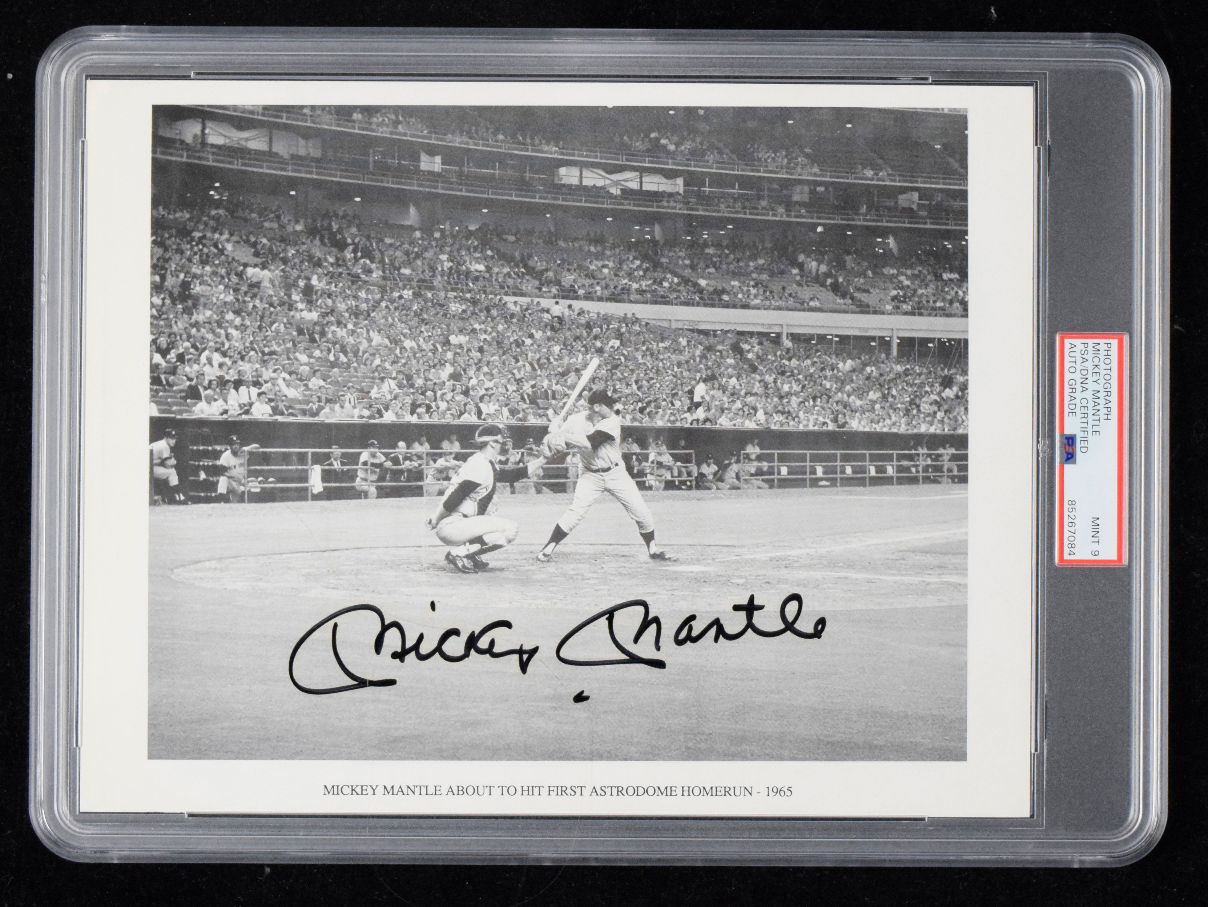 Description:Mickey Mantle autographed First Astrodome Homerun photo (PSA Mint 9) Black and white 8.5"x11" print showing Mantle as he hits the first homerun at the Astrodome. Signed in marker and authenticated/encapsulated by PSA with the autograph graded Mint 9: PSA Mint 9 autograph