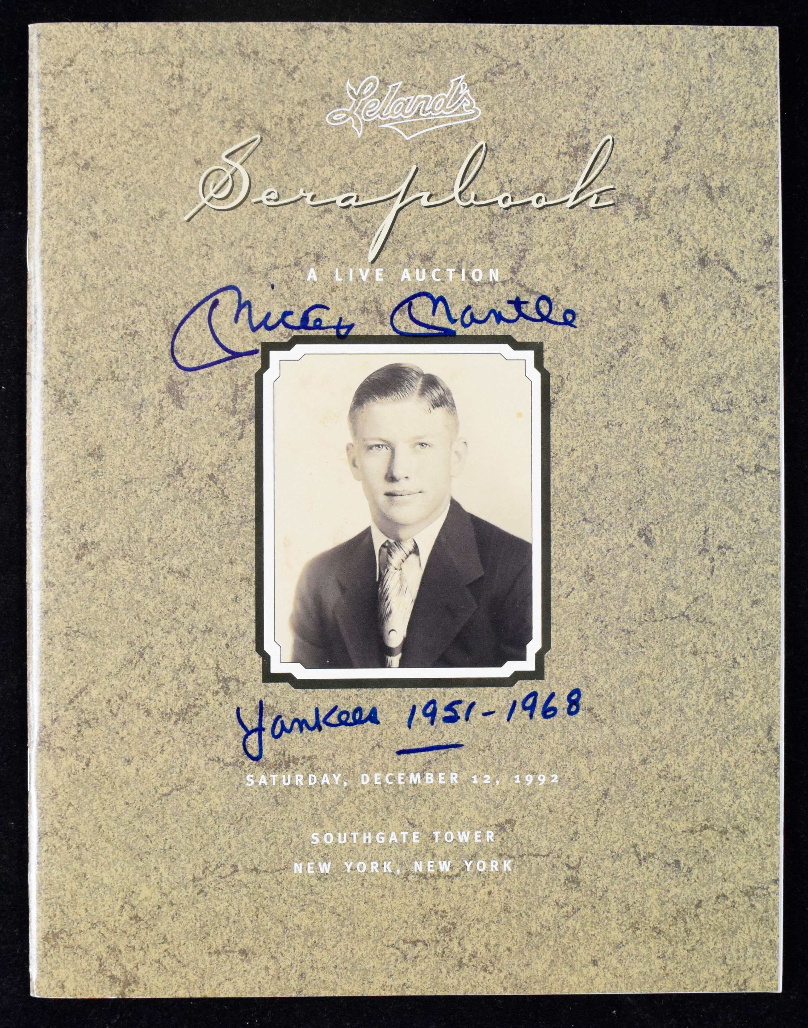 Description:Mickey Mantle autographed auction catalog with rare "Yankees 1951-1968" inscription (Sig. NM) 1992 Leland's auction catalog is signed "Mickey Mantle Yankees 1951-1968" on the cover in marker rating 9 out of 10: Sig. NM