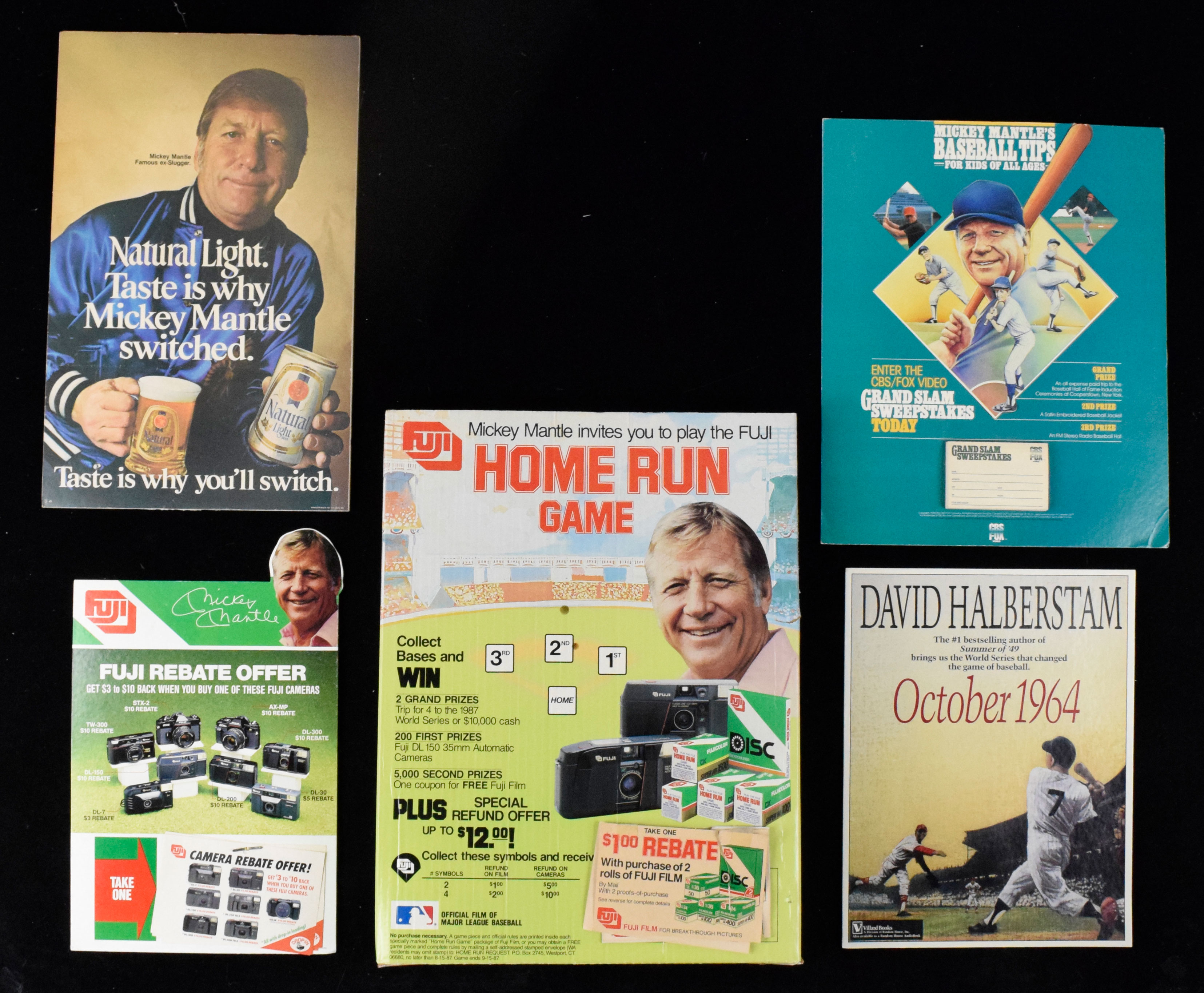 Description:Lot of (5) c.1980s-90s Mickey Mantle advertising display pieces (VG-EX/MT) Includes 16"x21"x3.25" advertising piece for Fuji film and cameras. A few scattered flaws and the pad of rebate coupons has rips/tears/tape (VG/EX); another 11"x16.5" piece issued by Fuji which has some light wear (EX-EX/MT); 11.5"x15" piece done to promote David Halberstam's book "October 1964" with a likeness of Mantle at bat (EX/MT-NM); 14"x17" display done to promote a "Grand Slam Sweepstakes" by CBS/Fox Video (VG/EX); 12"x19" poster for Natural Light which has some mild scattered wear and comes mounted to a backing board: VG-EX/MT