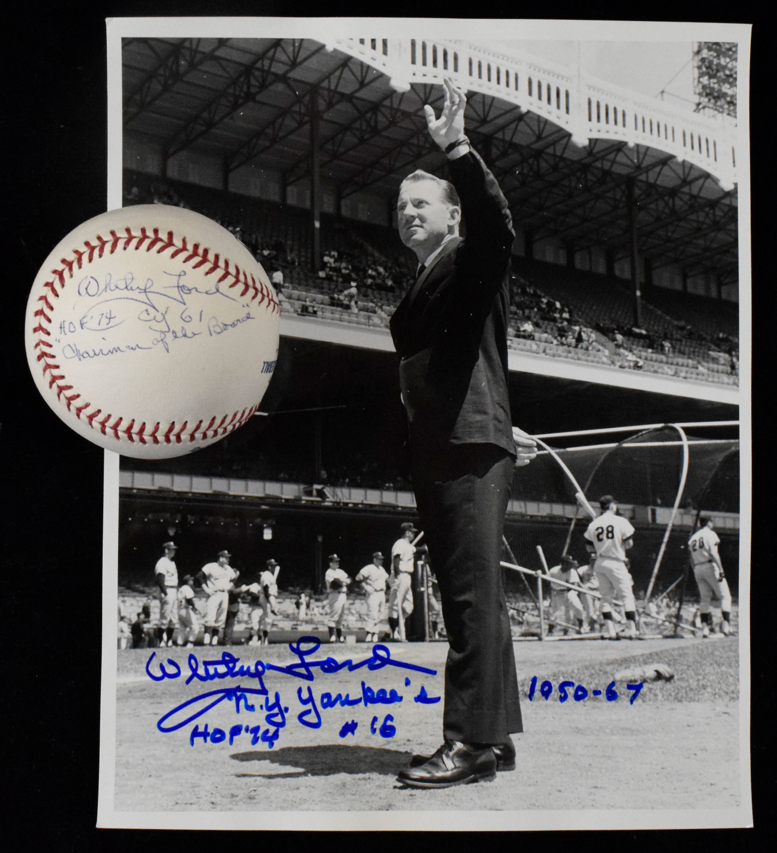 Description:Whitey Ford single signed and stat inscribed baseball (JSA) and photo (EX-NM) Rawlings B.Selig OML baseball has been signed on the side panel, "Whitey Ford, HOF 74, CY 61, Chairman of the Board" in ink rating 7/8 out of 10. JSA Authentication sticker affixed (A35294) however the COA is not included; black and white 8"x10" photo showing Ford at the time of his retirement which is signed "Whitey Ford, N.Y. Yankees 1950-67, HOF 74, #16" in marker rating 8/9 out of 10. Touch of wear to photo: EX-NM