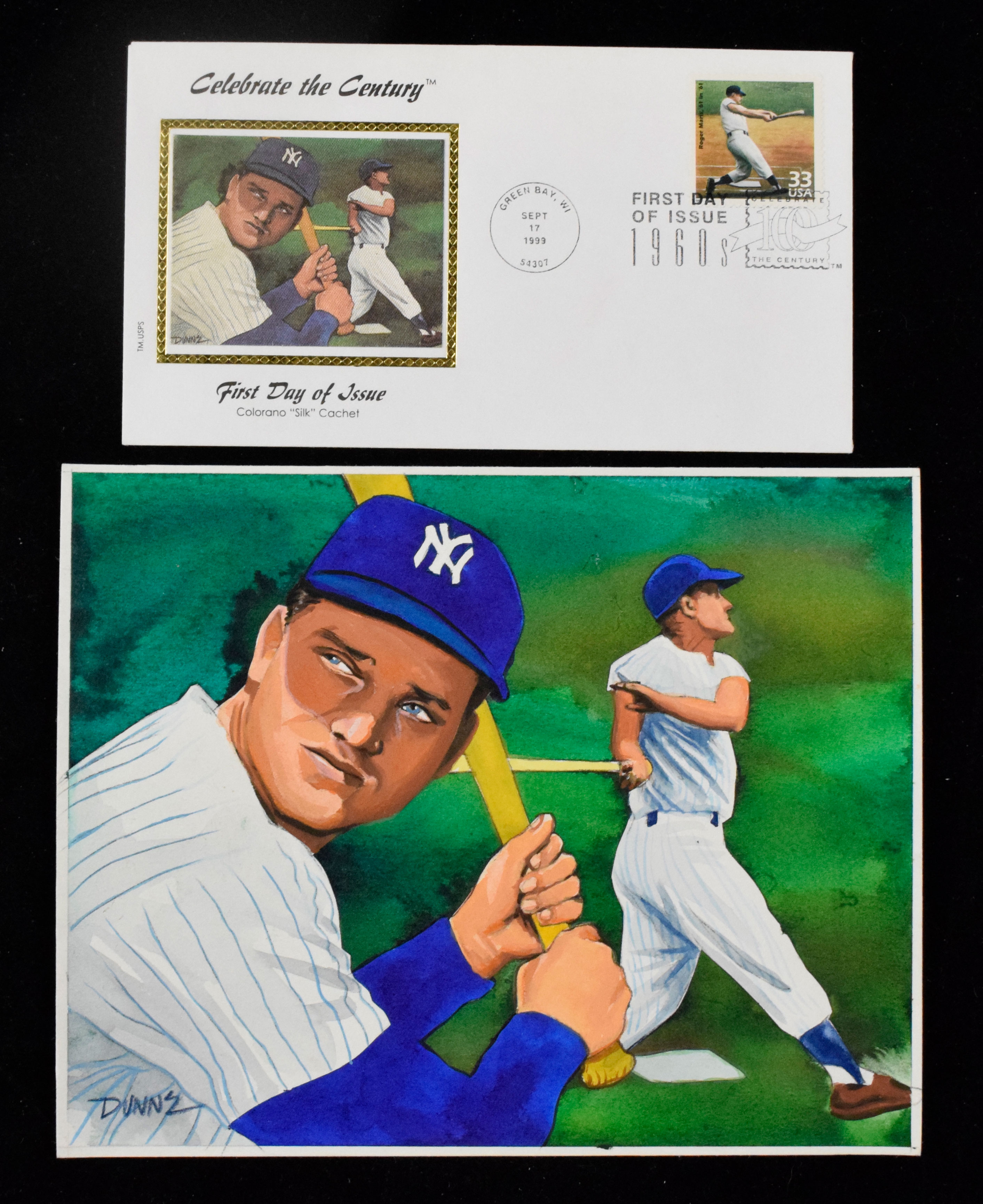 Description:Roger Maris original artwork for his Colorano Silk Cachet (EX/MT) Oustanding original watercolor (with additional embellishments) art work showing Roger Maris in a pair of poses. The piece measures 7.5"x6" and is signed by the artist ("Dunne") at lower left. Includes a first day cover with this artwork on the front: EX/MT