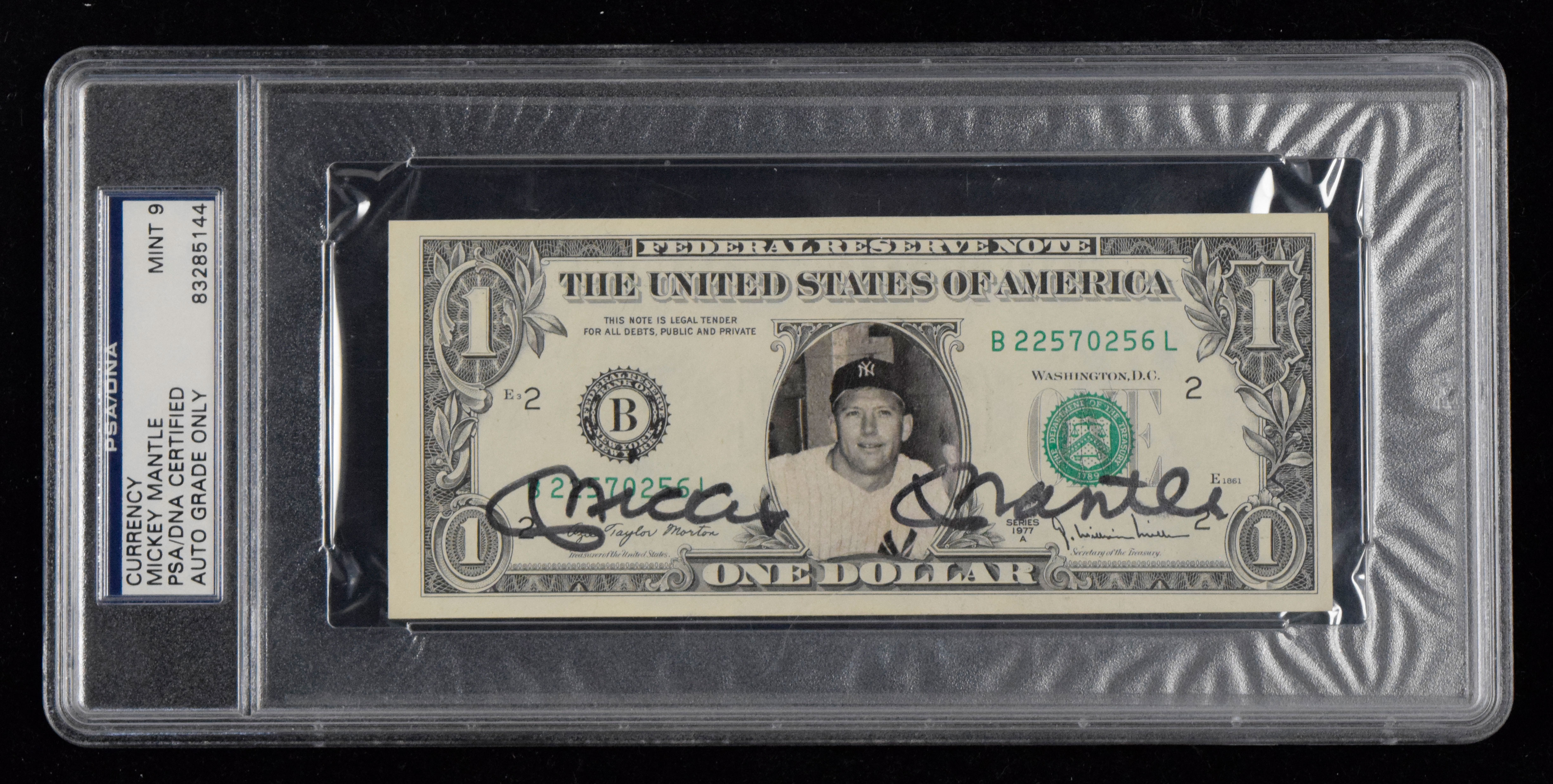 Description:Mickey Mantle autographed $1 bill (PSA Mint 9 autograph grade) Series A 1977 dollar bill has the likeness of George Washington covered by an image of Mickey Mantle. He has signed in black marker with the autograph graded "9" by PSA. Light handling wear: PSA Mint 9 autograph grade