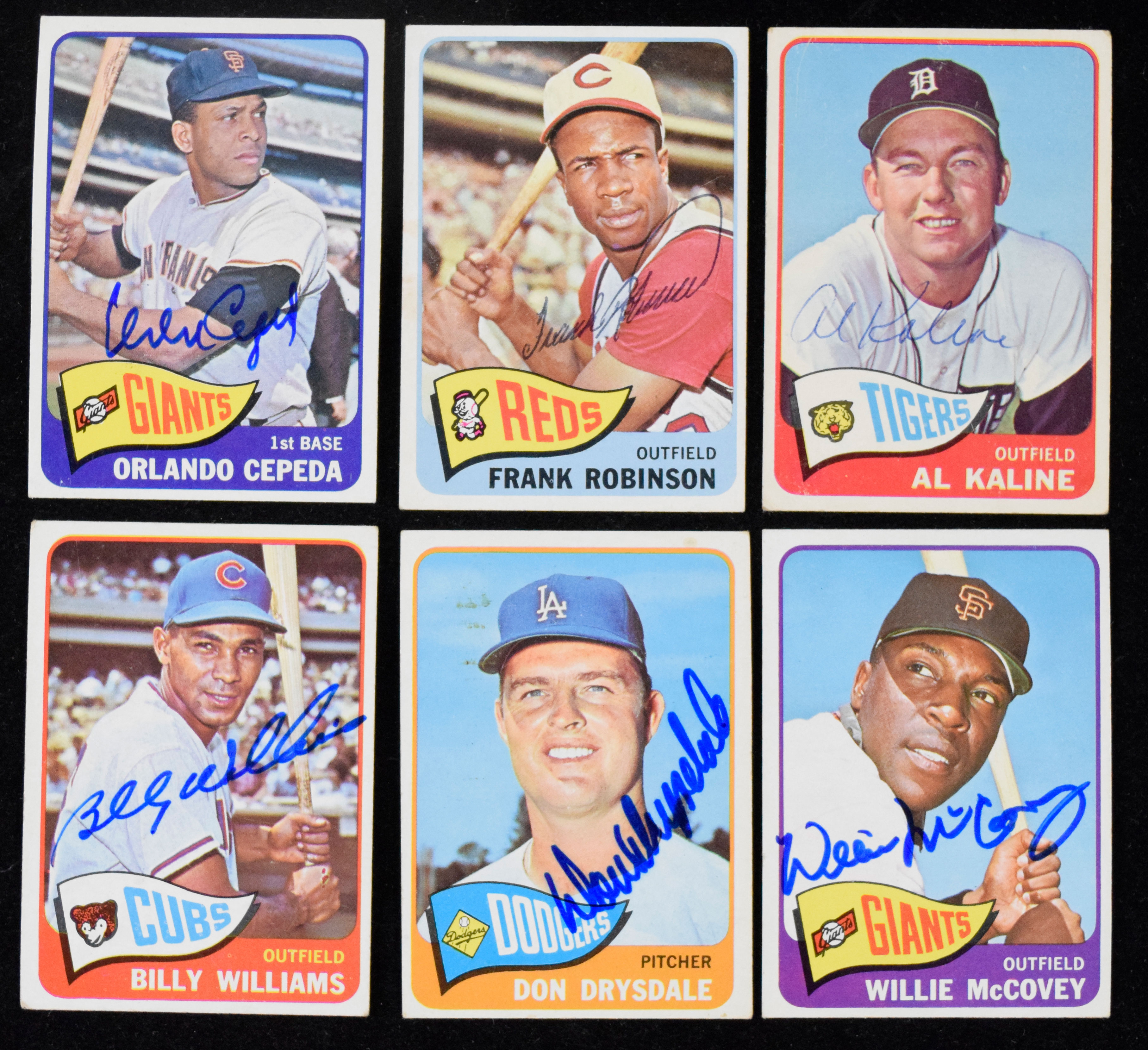 Description:Lot of (10) 1965 Topps Hall of Famer autographed cards (Sigs. EX-NM, Cards FR-VG) Includes Al Kaline, Frank Robinson, Brooks Robinson, Warren Spahn, Hoyt Wilhelm, Orlando Cepeda, Bill Mazeroski, Billy Williams, Willie McCovey, and Don Drysdale. Signatures rate 7 to 9 out of 10. Varying degrees/types of wear throughout with cards in FR-VG range of condition: Sigs. EX-NM, Cards FR-VG