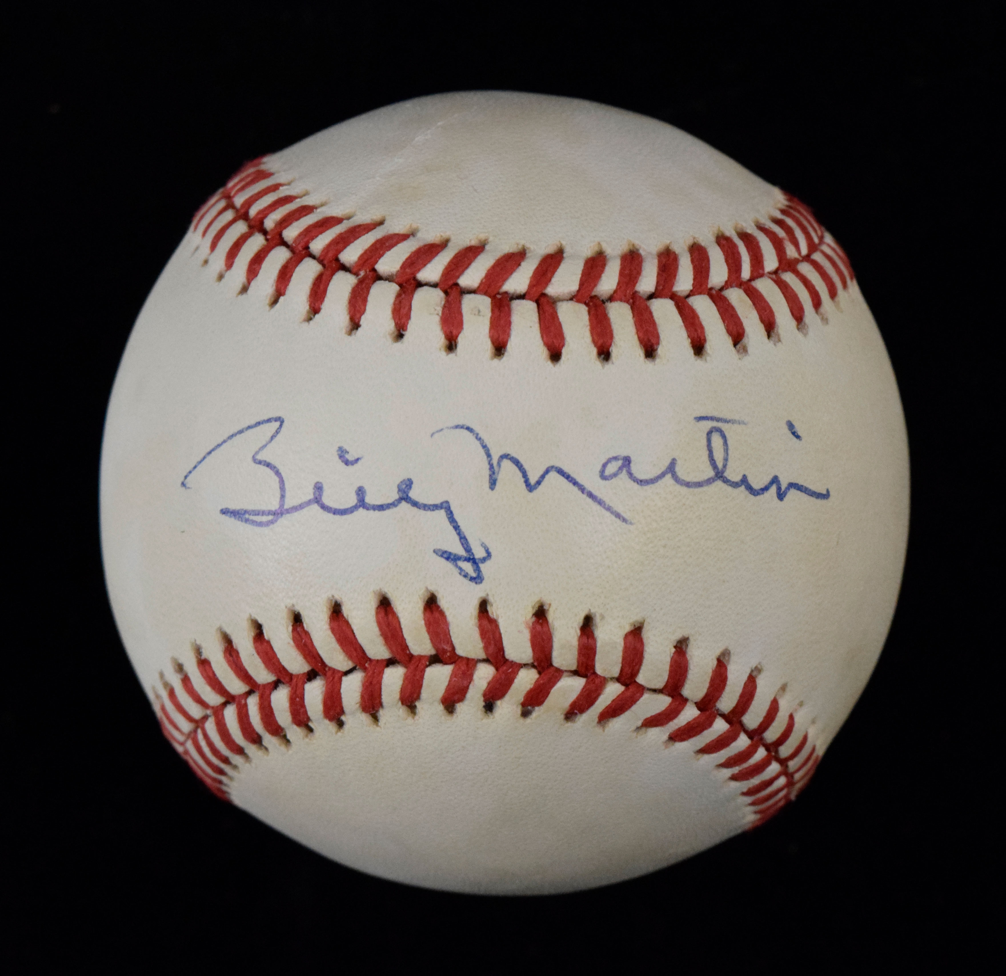 Description:Billy Martin single signed baseball (full JSA LOA) (EX/MT) Rawlings B.Brown OAL baseball has been signed in ink rating 8 out of 10. Minor scattered toning/spotting. Includes full LOA from JSA: EX/MT