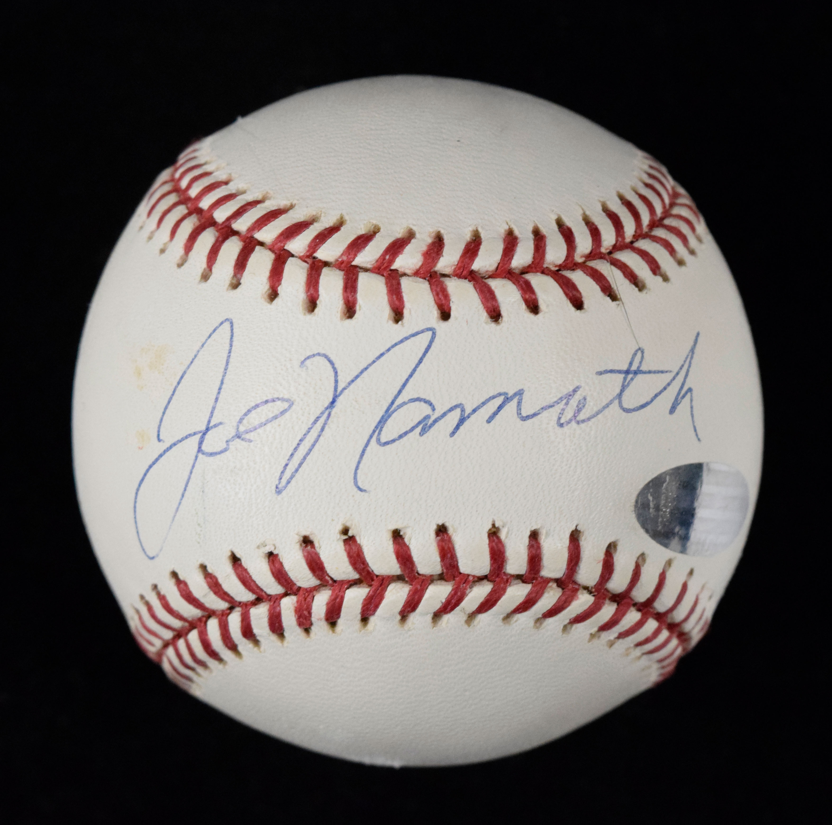 Description:Joe Namath single signed baseball (Steiner) (EX/MT) Rawlings B.Selig OML ball signed in ink rating 8 out of 10. There is a very small blemish to the left of the autograph and a toned outline of where it appears an authentication hologram was removed near the stampings. Includes Steiner COA: EX/MT