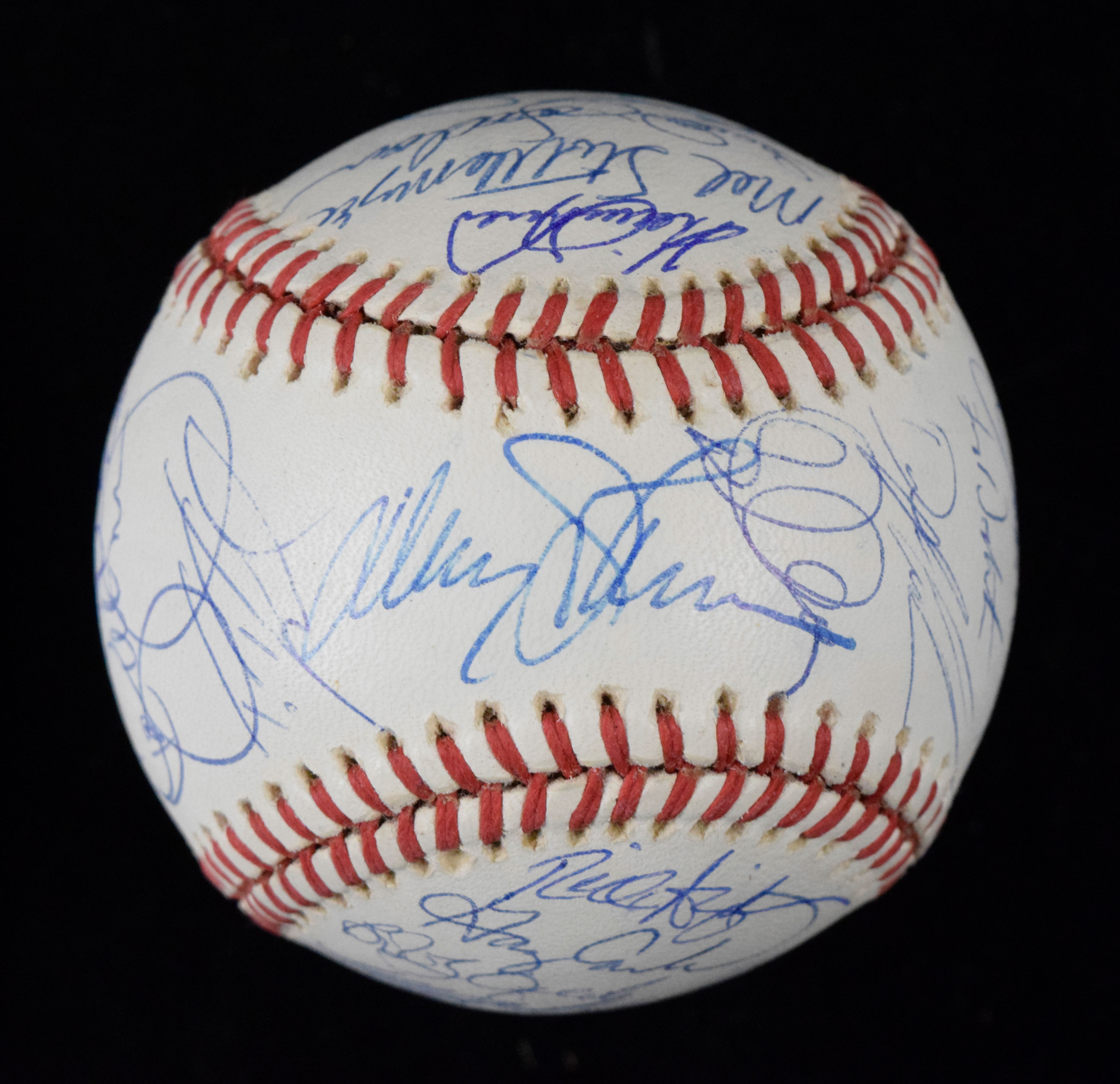 Description:1986 New York Mets team signed World Series logo baseball (full JSA LOA) (EX/MT-NM) Rawlings Official 1986 World Series logo baseball has been signed by (31) incl. Gary Carter, Doc Gooden, Jesse Orosco, Keith Hernandez, Ray Knight, Sid Fernandez, Lenny Dyskstra, Mookie Wilson, Howard Johnson, Darryl Strawberry, and others. Ink signatures rate 7/8 to 8 out of 10. Includes full LOA from JSA: EX/MT-NM