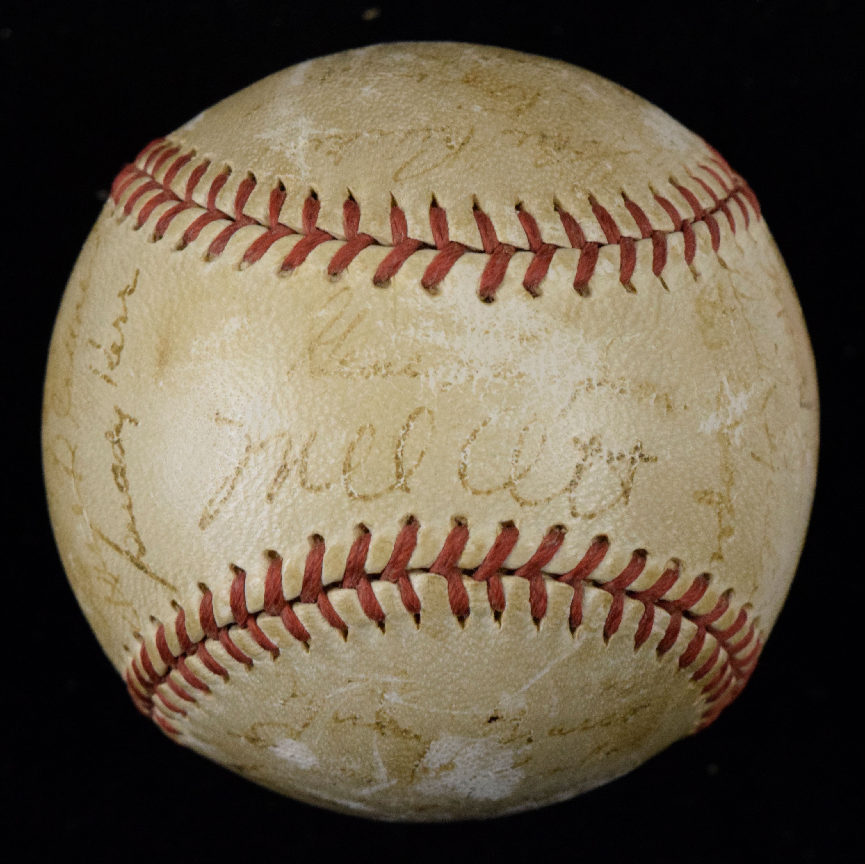Description:1946 New York Giants team signed baseball with Mel Ott (GD-VG) Spalding "Official League Leader" baseball has been signed by approx (27) with the most notable being Mel Ott who appears on the sweetspot rating approx. 6-6/7 out of 10. Others rate an average 5/6 out of 10 with some having largely faded from view and include Al Schact, Mickey Witek, Walker Cooper, Sid Gordon, and Williard Marshall.Toning/soiling and scattered wear to ball: GD-VG