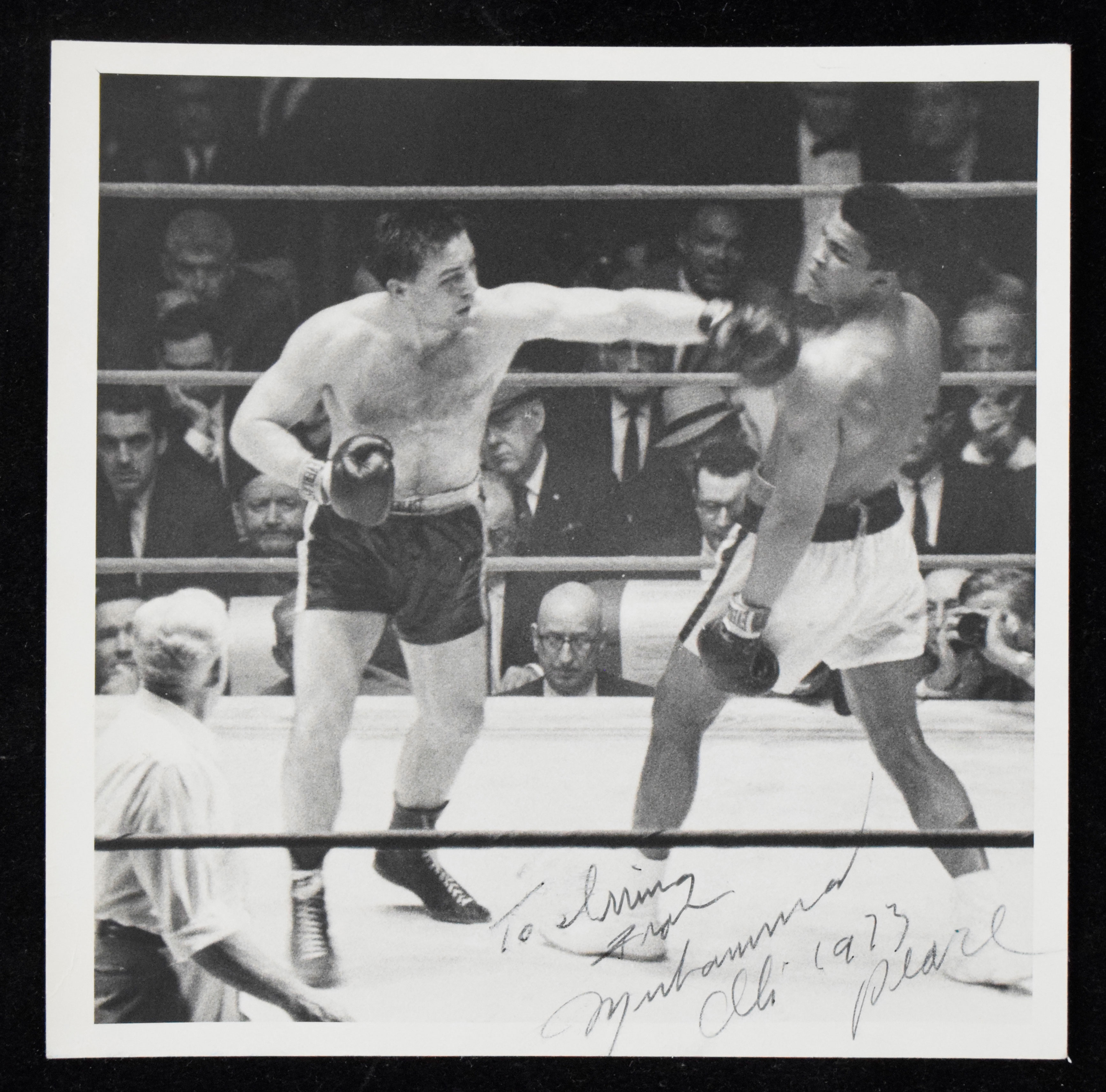 Description:1973 Muhammad Ali autographed photo (vs. George Chuvalo) (EX-EX/MT) Vintage 7.25"x7.25" photo has been signed "To Irving from Muhammad Ali, 1973, Peace" in marker rating 7 out of 10 (some minor flaws/feathering). "Toronto Star Photo" and "Photo By Doug Griffin" stamps on back along with some other markings: EX-EX/MT