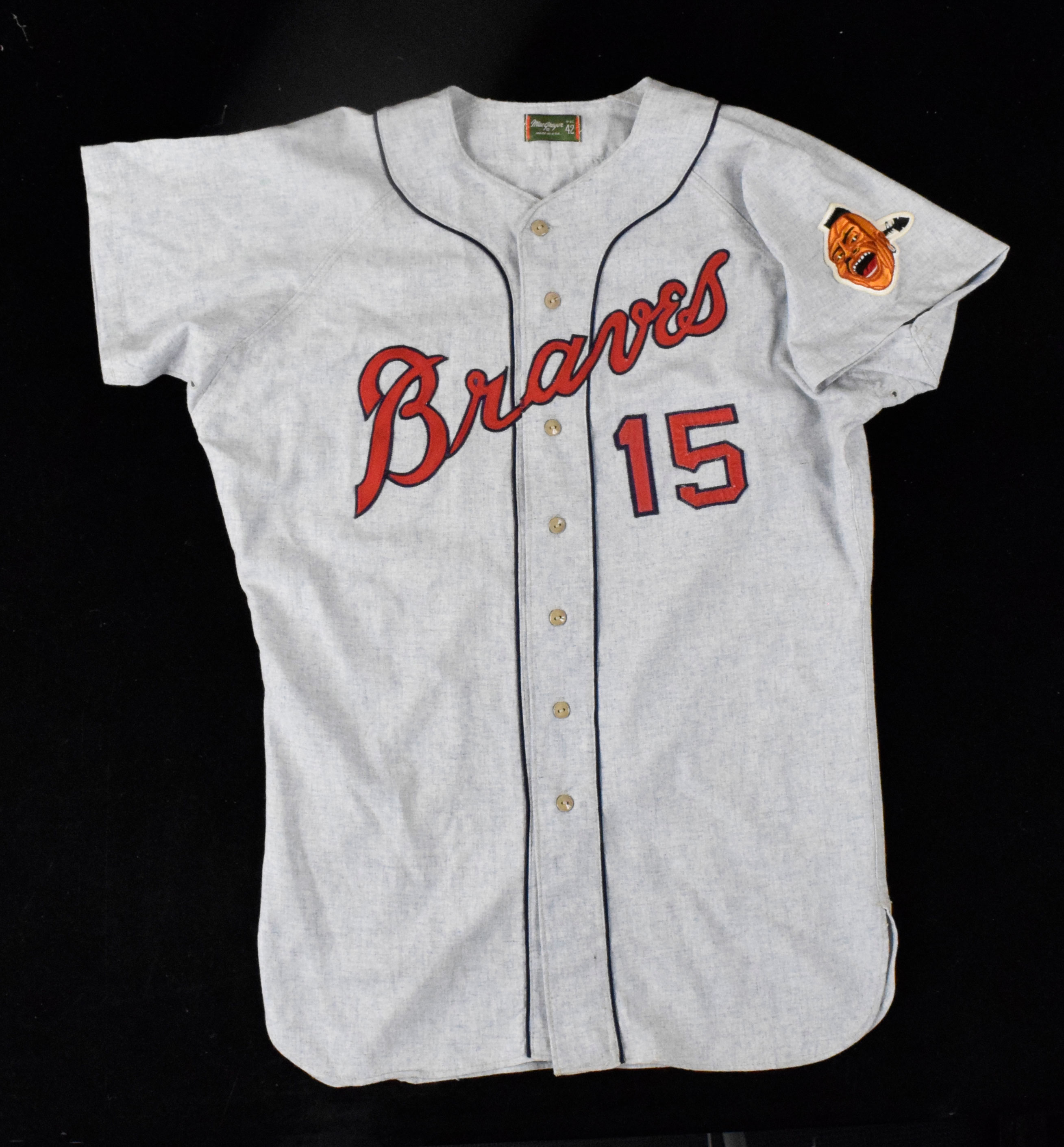 Description:c.1960s Braves professional quality jersey - possible sample or Minor League (EX) Flannel jersey has "Braves" team name across the front and number "15" on front and back. MacGregor tag in the collar (size 42) is not a style that the Atlanta Braves seems to have used (suggesting this is a sample or possibly Minor League jersey). Wash tag inside: EX