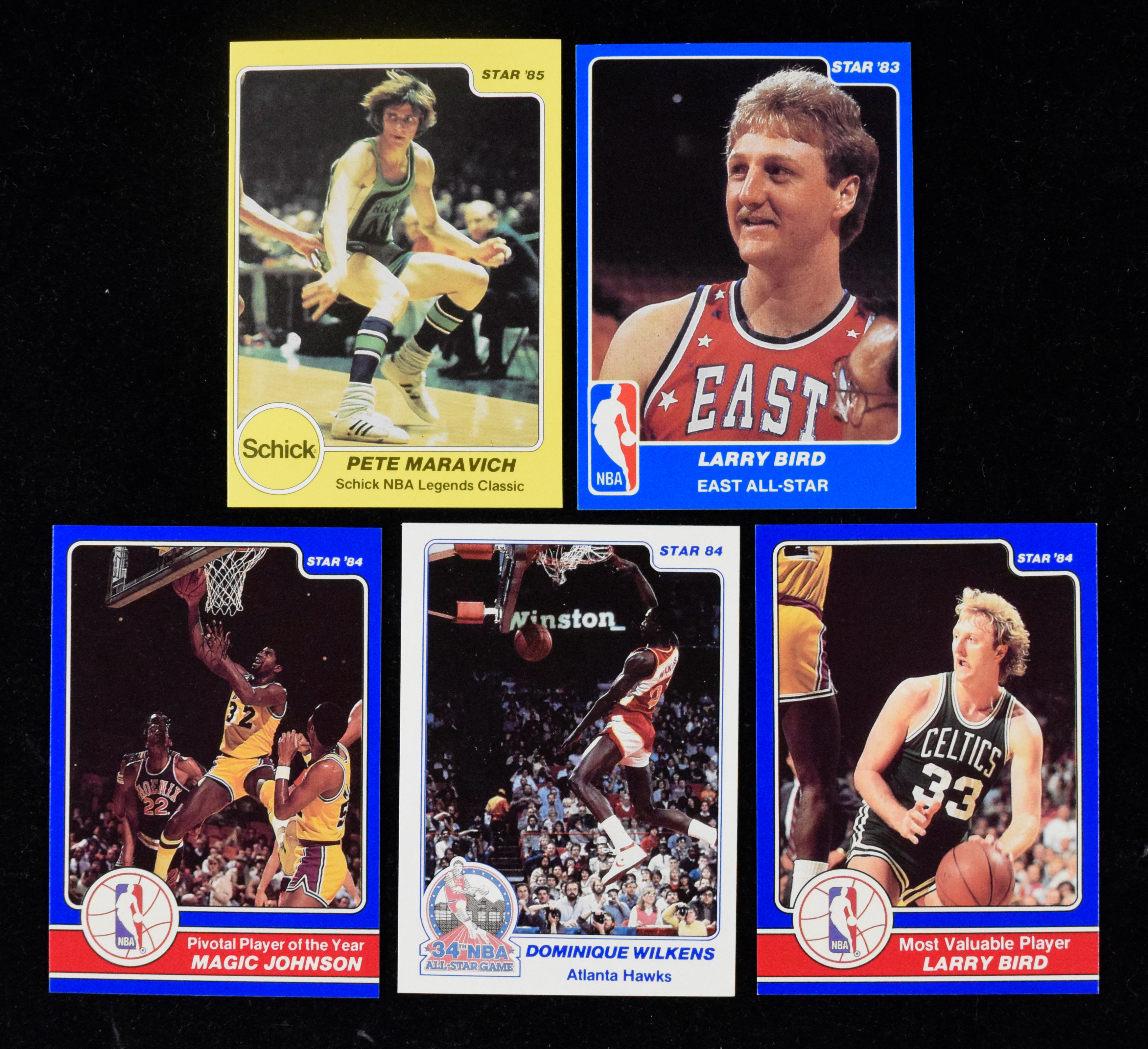 Description:Lot of (4) 1983-1985 Star Basketball complete or near complete sets (Avg. EX/MT-NM) Includes 1983-84 Star All-Stars near complete set (29 of 30 cards, missing #11); 1984 Star Award Banquet complete set (24 cards); 1984 Star Slam Dunk complete set (11 cards); 1985 Star Schick NBA Legends complete set (25 cards). Average EX/MT-NM condition with EX-NM/MT general range: Avg. EX/MT-NM