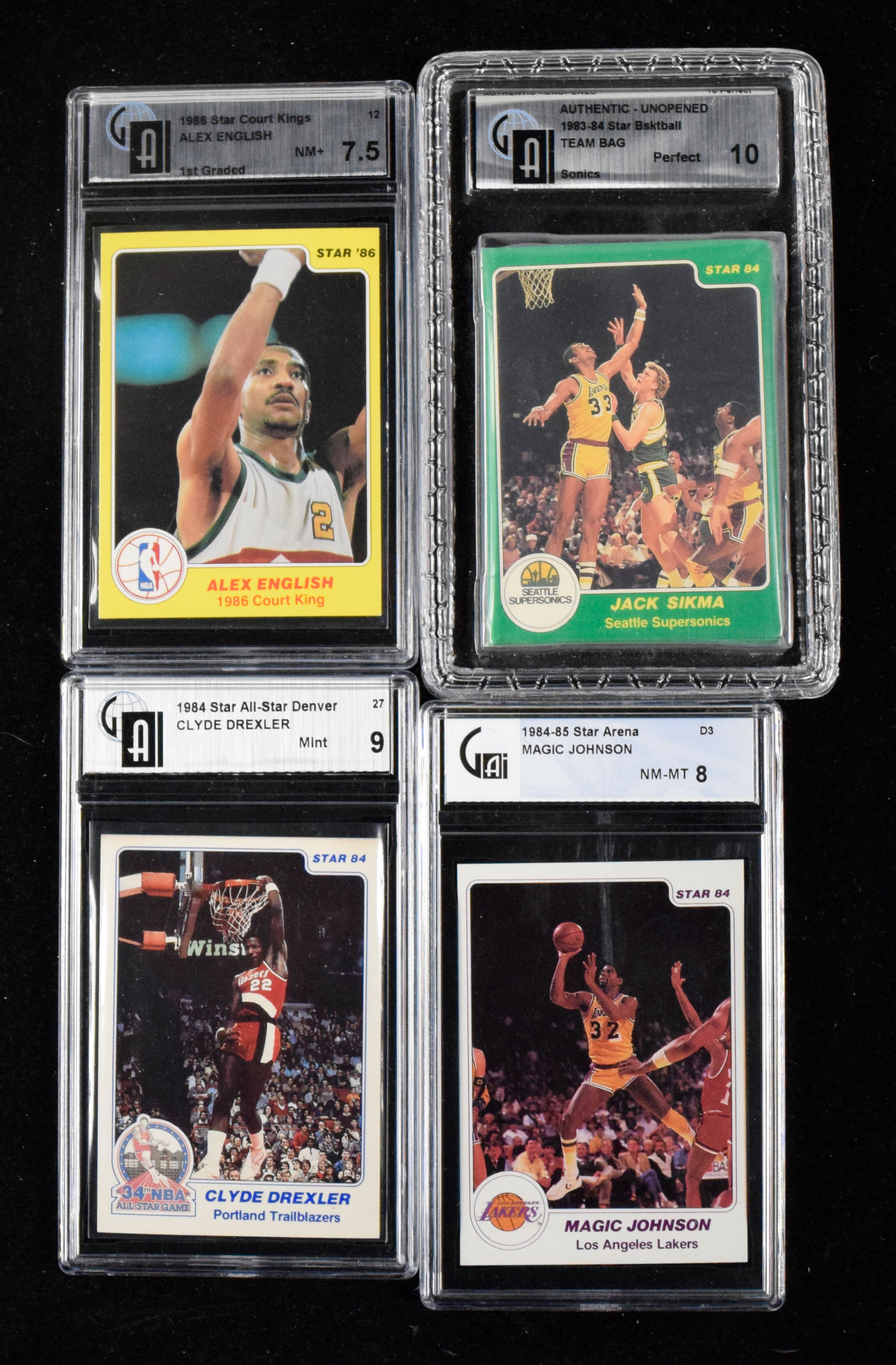 Description:Lot of (10) 1984-1986 Star Basketball cards plus 1983 Sonics bagged team set (See description). Assortment of cards graded by GAI or ?Beckett under their BCCG program. As such, we will relay the grades but it should be assumed that the cards would not fall at those levels if submitted to a 3rd party today. Includes 1983-84 Seattle Supersonics team set in original bag (GAI Perfect 10); 1984-85 Star Arena #D3 Magic Johnson (GAI NM-MT 8) and 11B Mark West (GAI NM-MT+ 8.5); 1984 Star All-Star #27 Clyde Drexler (GAI Mint 9); 1984 Star Celtics Champs #9 Worth (BCCG 9); 1984-85 Star #269 Terry Taylor (GAI NM-MT+ 8.5); 1986 Star Court Kings #12 Alex English (GAI NM+ 7.5); 1985-86 Star #14 Laimbeer, 76 Johnson, 139 Anderson, and Robertson (all BCCG 10): See description