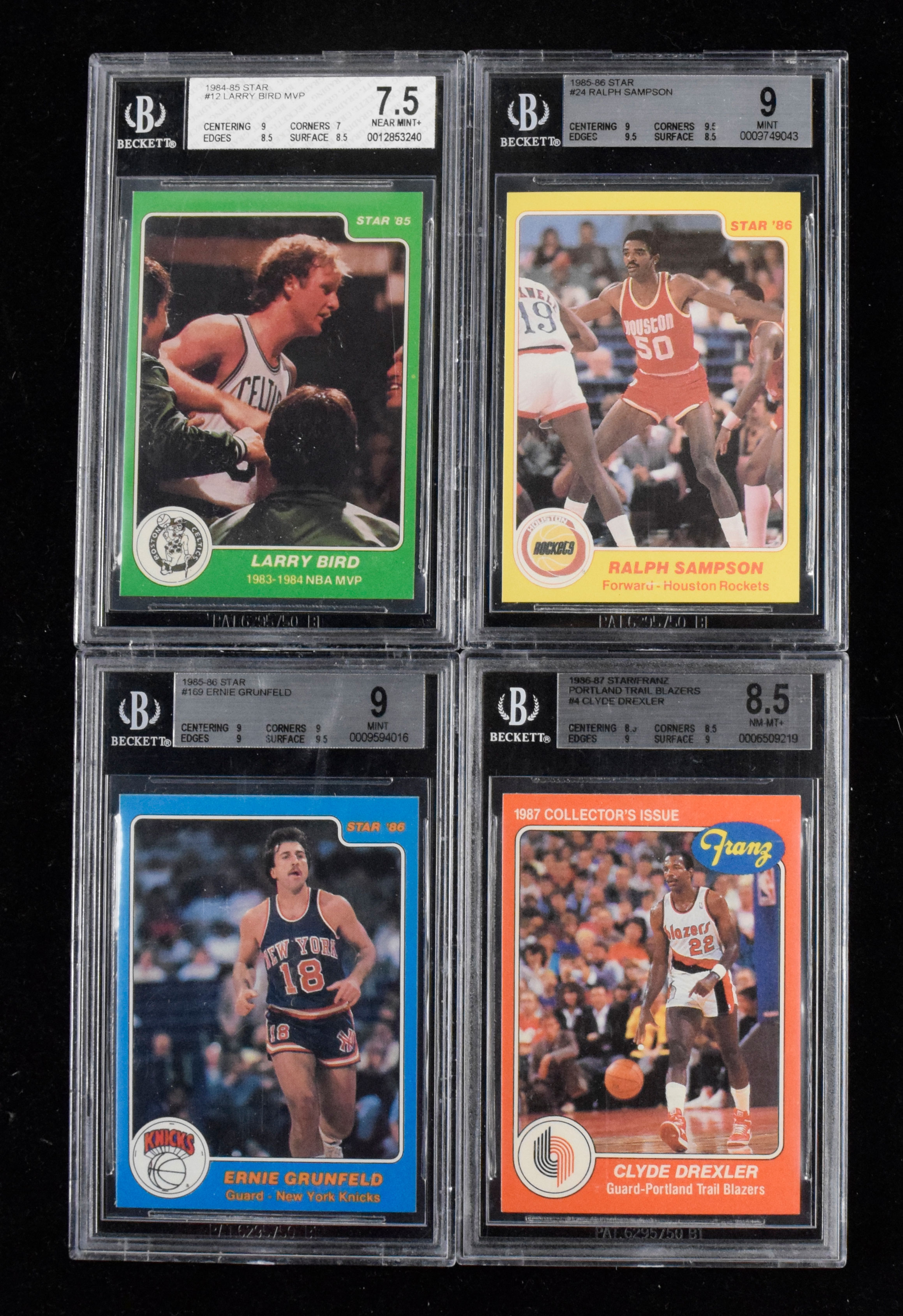 Description:Lot of (11) BGS graded 1985-1986 Star (and Fleer) Basketball cards (BGS 7 to BGS 9) 1984-85 #12 Larry Bird (BGS 7.5 NM+); 1986-87 Franz #4 Drexler (BGS 8.5 NM-MT+) (this card produced by Fleer); BGS 9 1985-86 Star #24, 169 and 170; BGS 8 1985-86 #142; BGS 8.5 1985-86 Star #25; BGS 8.5 1985-86 Star #22 and 23; BGS 7 1985-86 Star #20 and 124: BGS 7 to BGS 9