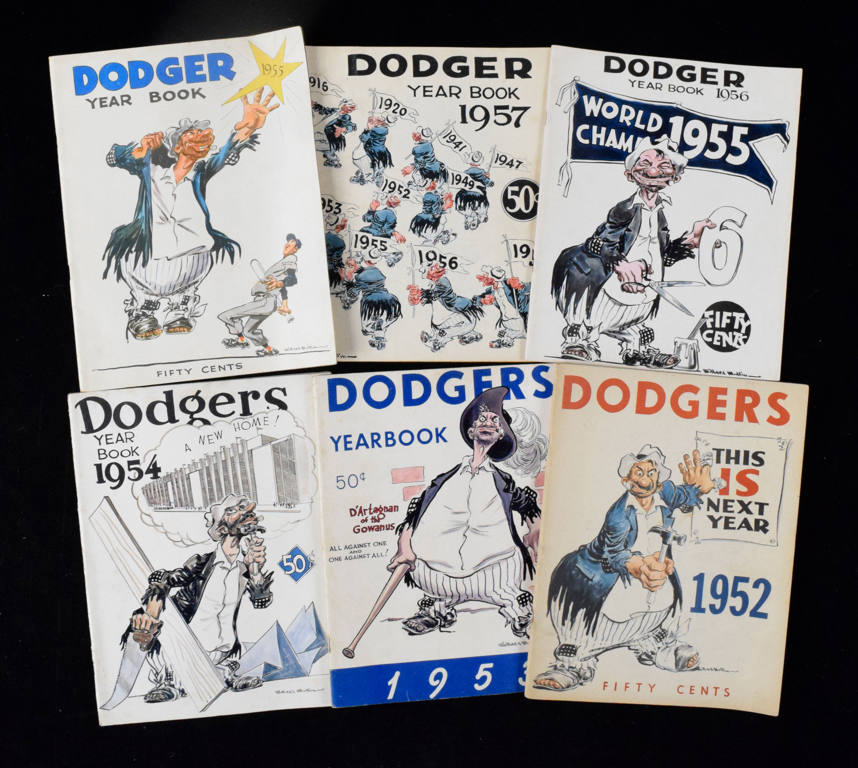 Description:Lot of (11) 1941-1957 Brooklyn Dodger yearbooks (GD-EX, see description) Varying degrees/types of wear throughout and PLEASE NOTE - all have a musty smell. Includes 1941 (EX); 1947 "Beloved Bums" (publication which is more often than not referred to as their 1947 yearbook) (GD); 1949 (VG/EX); 1950 (VG); 1951 (EX); 1952 (VG); 1953 (VG/EX); 1954 (EX); 1955 (VG); 1956 (VG/EX); and 1957 (EX): GD-EX, see description