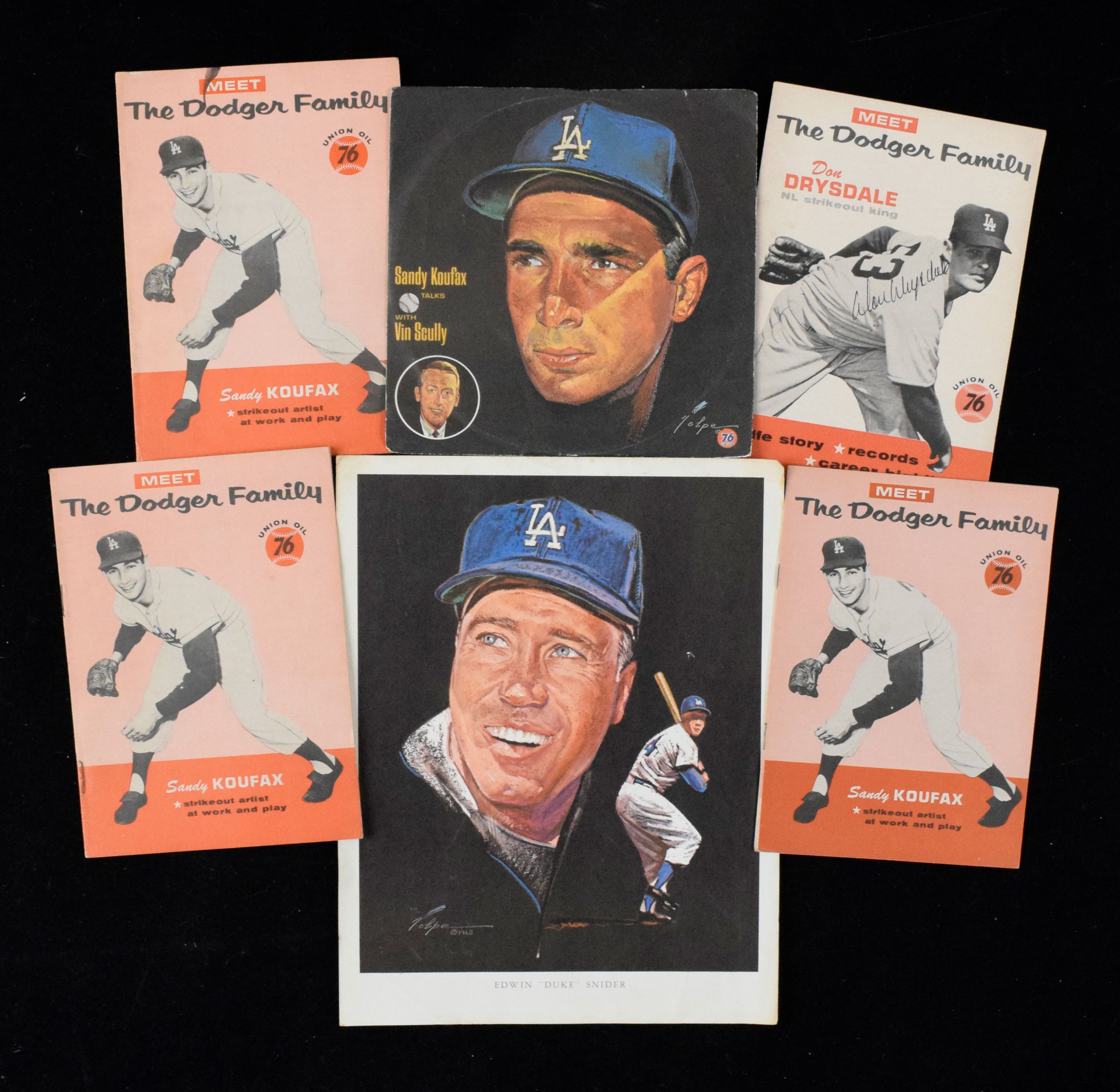 Description:Lot of (39) 1961 Union Oil "Dodger Family" booklets (Avg. VG) Nice lot in average VG condition and there are a few pieces lesser and some better. PLEASE NOTE - all have a musty smell. Includes (1) autographed Johnny Podres, Sandy Koufax, (2) Walt Alston, (3) Don Drysdale, (2) Gil Hodges, Duke Snider, and (2) Vin Scully: Avg. VG