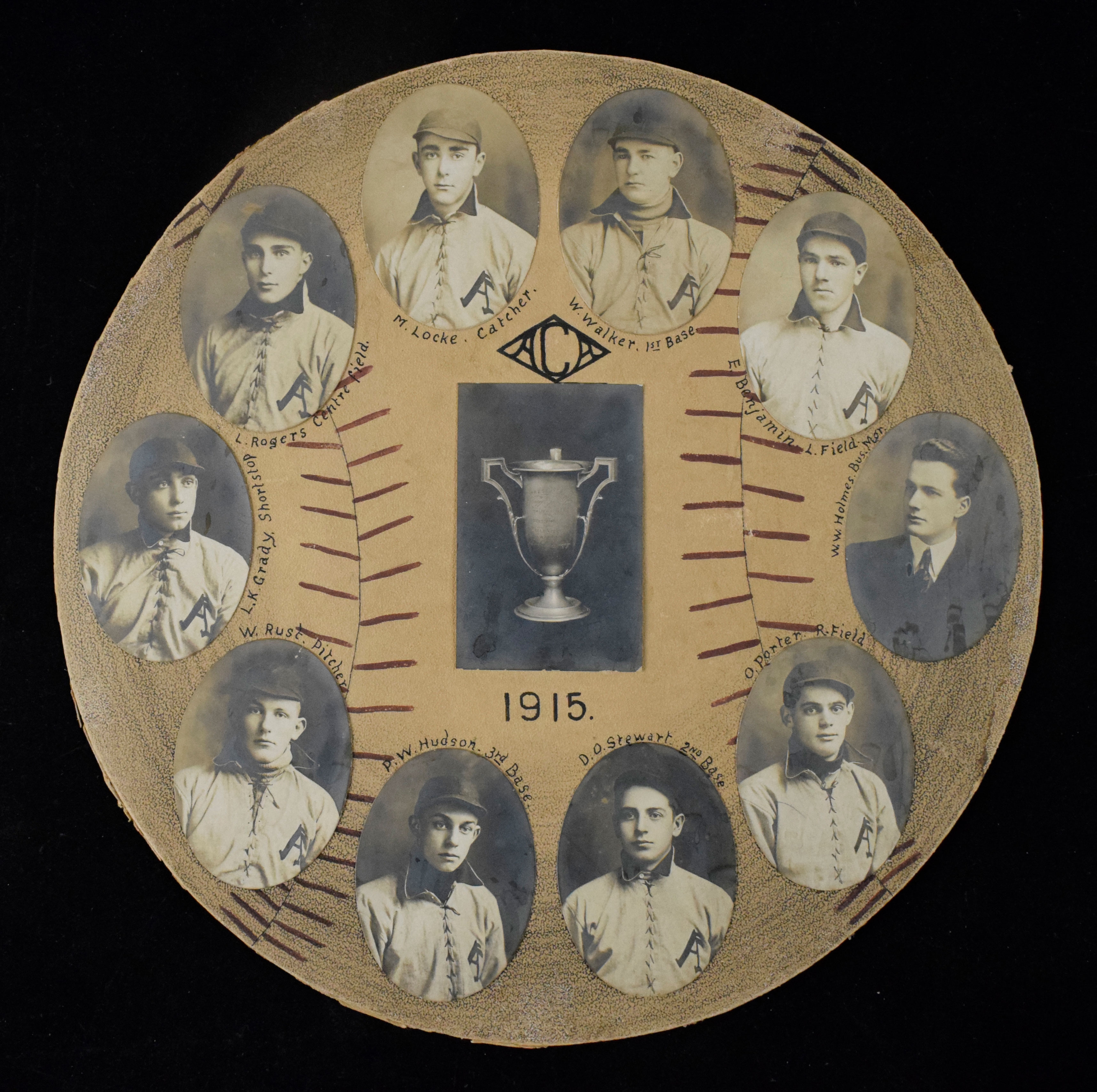 Description:1915 Halifax area baseball team photographic display (VG-EX) Display piece was hand made in the period and is baseball shaped (14" across) with images of players and related personelle affixed. At the center is a picture of a trophy cup which under magnification appears to be engraved to reflect a Halifax Nova Scotia related baseball team/event winner. The year "1915" is hand written as are player names and some decorative accents. Mild general wear: VG-EX