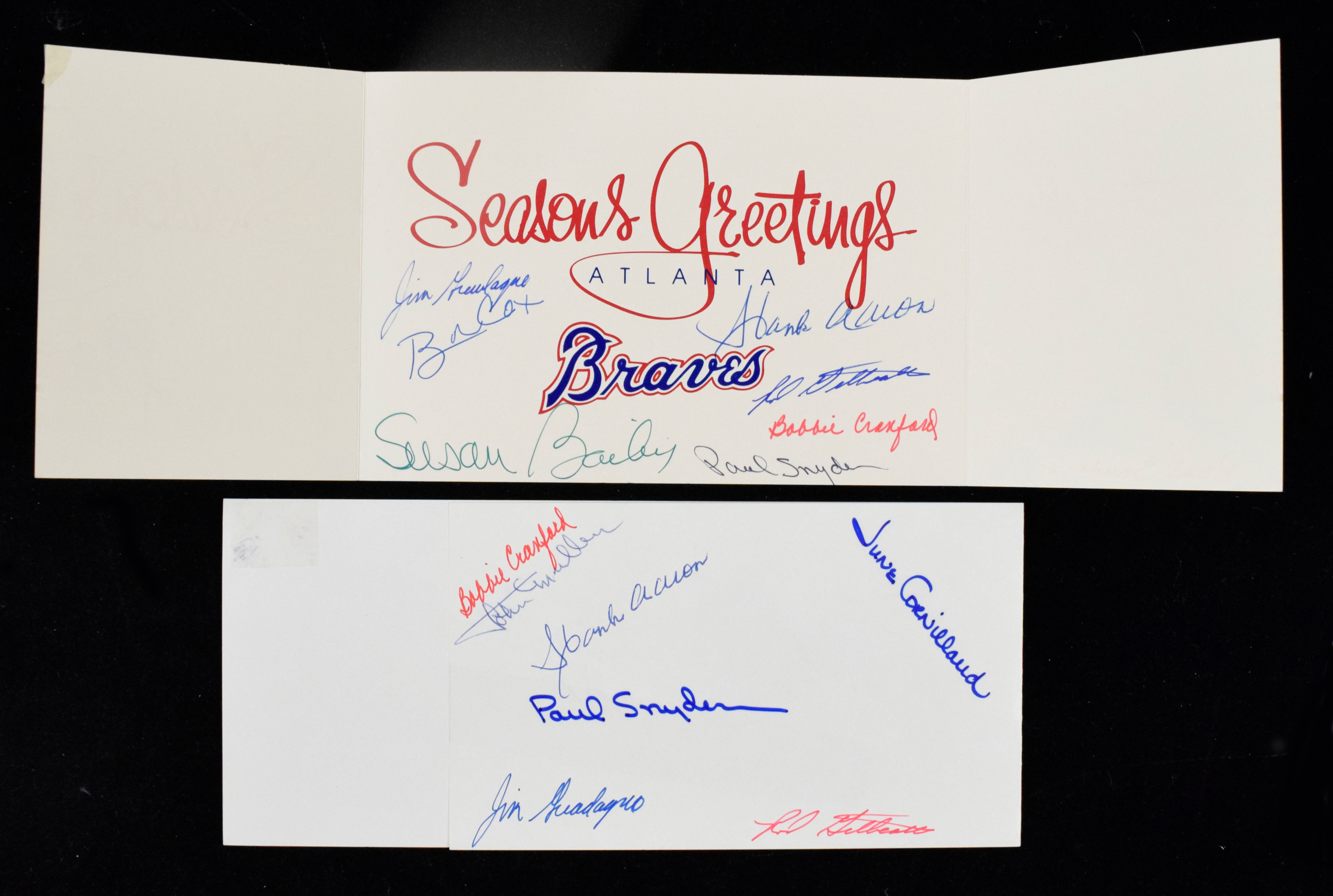 Description:Lot of (2) Atlanta Braves "Seasons Greetings" cards signed by Hank Aaron and others (EX-NM) Pair of holiday cards are each signed by Braves personelle including Hank Aaron, Bobby Cox, and others. Signatures rate 8 out of 10 or better. Light handling wear: EX-NM