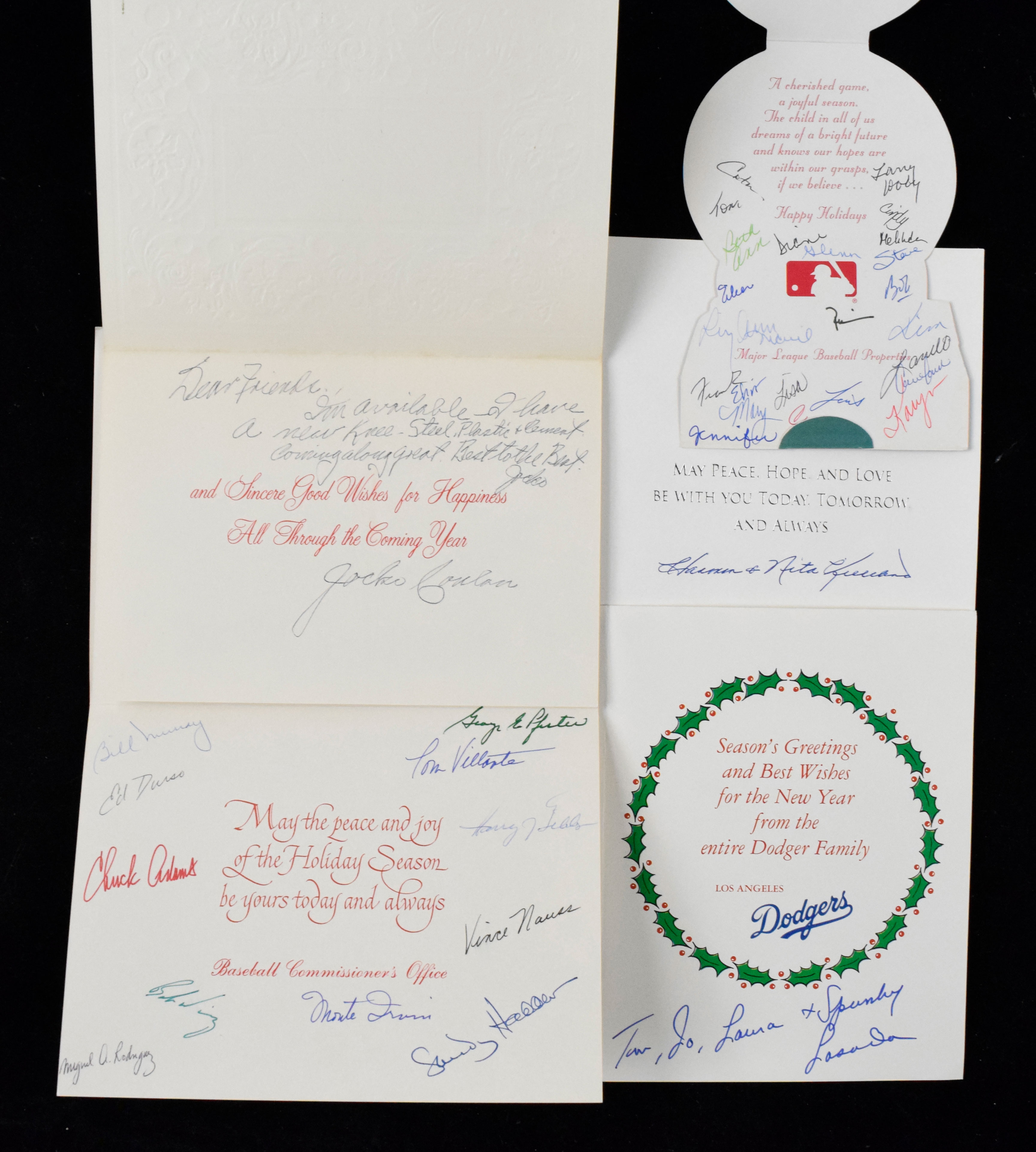Description:Lot of (15) Baseball Hall of Famer Christmas or Seasons Greetings card (most signed by HOFer) (EX-NM) Nice lot of Christmas and or general Seasons Greetings cards includes (6) from the Office of The Commissioner and/or other Major League Executive offices signed by Monte Irvin and other front office members along with (1) signed by Larry Doby and others; (1) Jocko Conlan; (2) Dick Williams (signed by his wife); (2) Walt Alston (signed by his wife); Tom Lasorda; and (2) Harmon Killebrew (one signed only with his first name). Signatures rate 7 to 9 out of 10 and there is some light handling wear: EX-NM