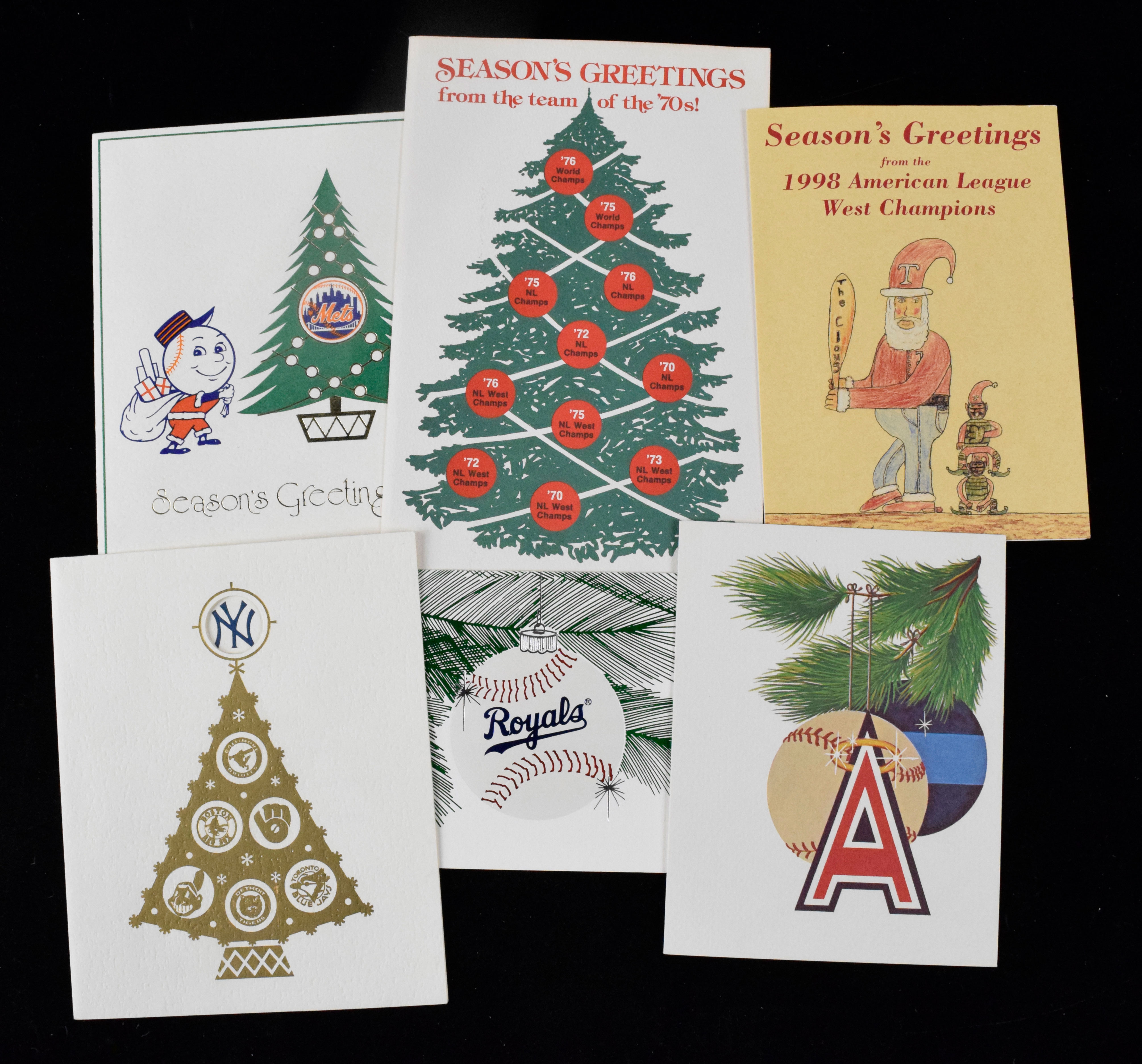 Description:Lot of (94) Major League Baseball team sent Christmas and/or Holiday Greeting cards (EX-NM) Nice lot with most pieces likely dating from the 1980s and 90s however there are some more recent and (2) or (3) from the late 1970s. Many are signed by team related personelle. Includes (9) Cincinnati Reds; (5) New York Yankees; (16) LA Dodgers; (3) Colorado Rockies; (1) Florida Marlins; (3) Oakland Athletics; (10) Toronto Blue Jays (2 multi signed incl. Pat Gillick); (9) Texas Rangers; (1) KC Royals; (10) Angels; (7) Indians; (7) Giants; and (13) New York Mets: EX-NM
