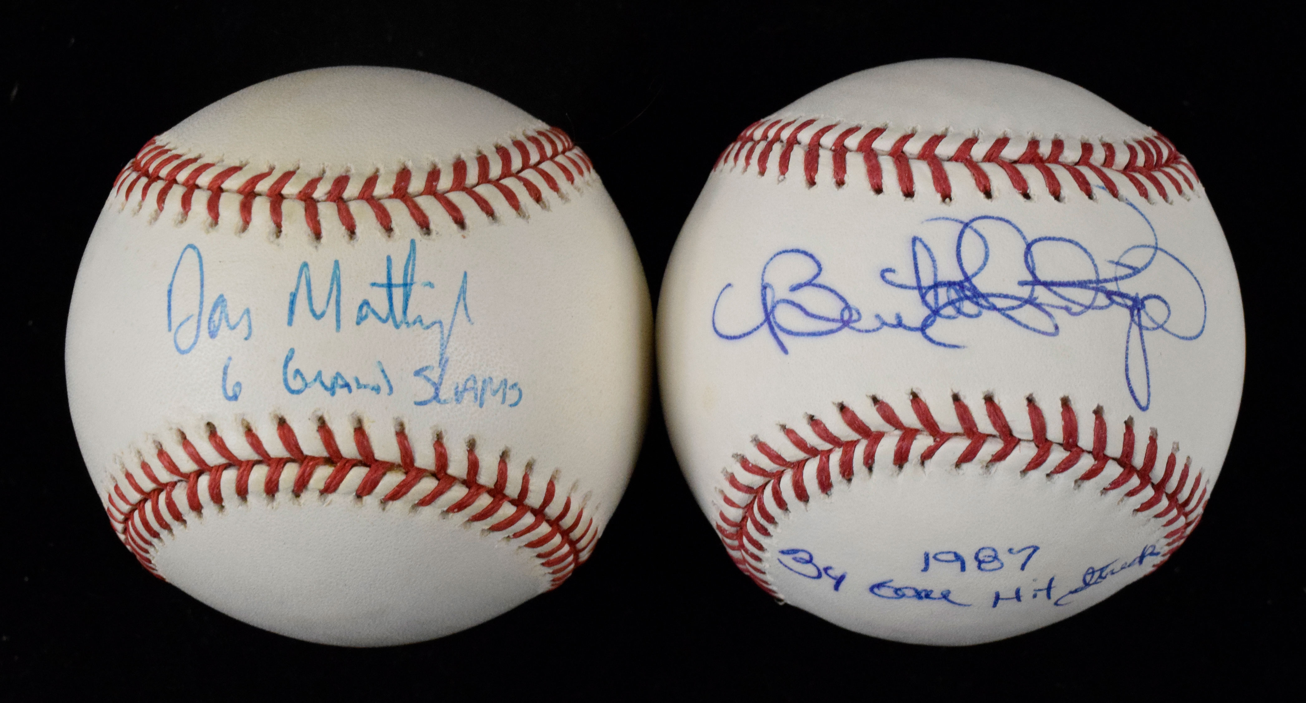 Description:Don Mattingly and Benito Santiago single signed baseballs with inscriptions (EX-NM) Includes G.Budig OAL ball signed "Don Mattingly 6 Grand Slams" (light toning) and B.Selig OML ball signed by Santiago with "1987 34 Game Hit Streak" inscription. Signatures rate 7/8 out of 10. Mattingly has JSA sticker affixed (COA is NOT included): EX-NM