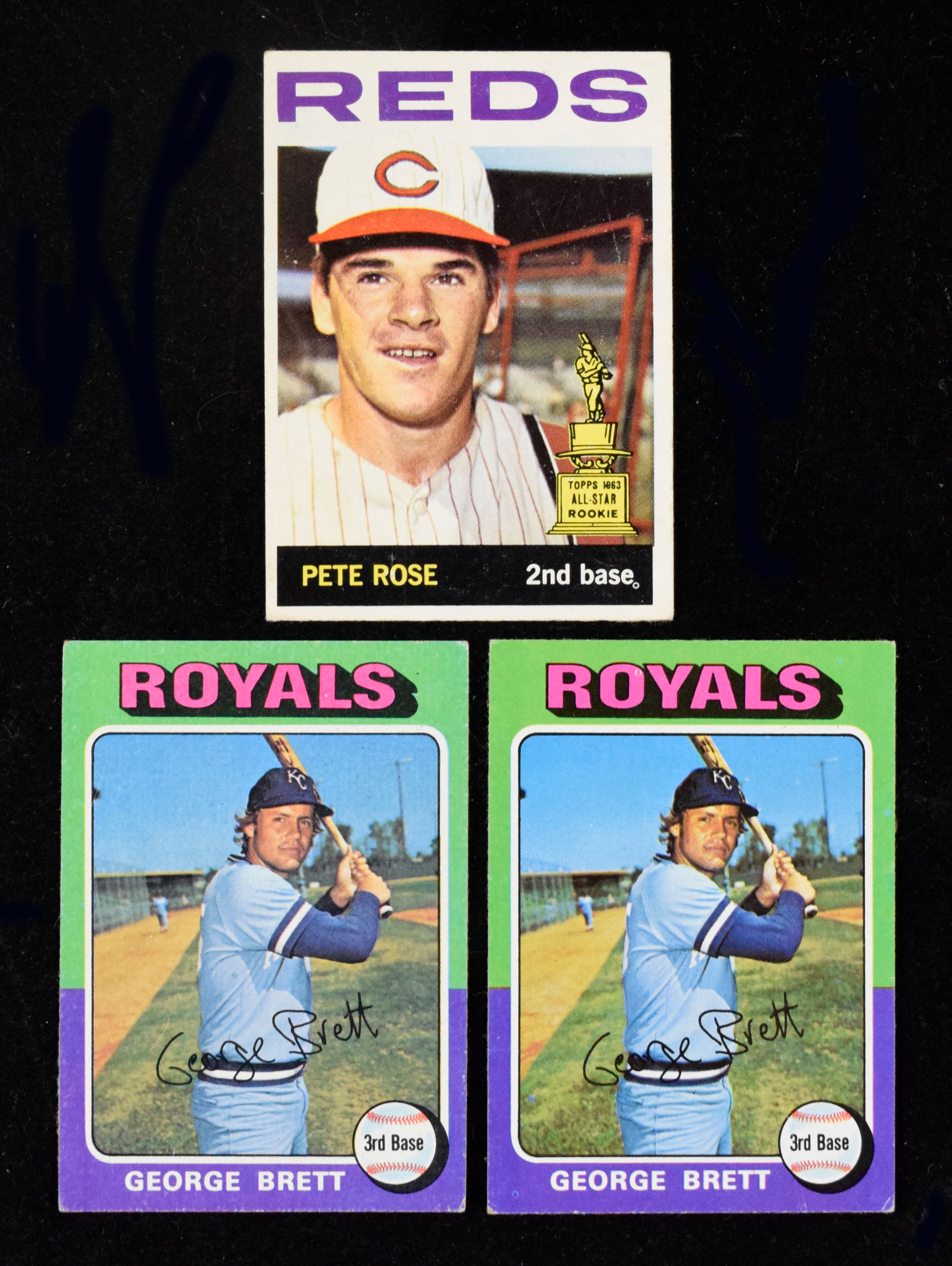 Description:Pete Rose 1964 Topps and (2) George Brett 1975 Topps rookie cards (VG-VG/EX). Includes 1964 Topps #125 Rose (VG), and (2) 1975 Topps #228 Brett rookies (VG and VG/EX).